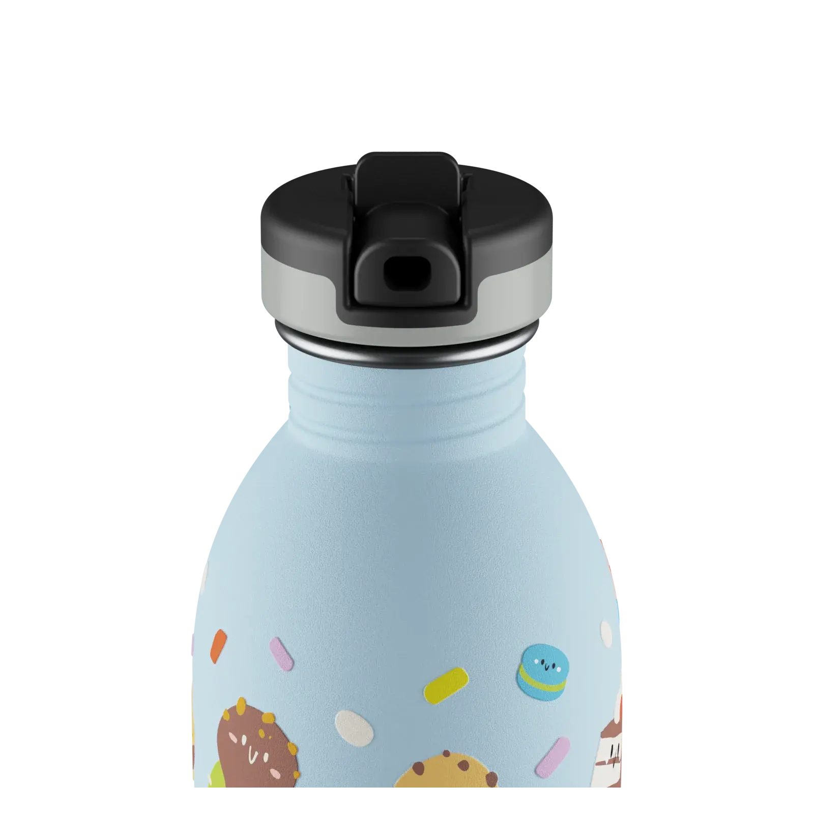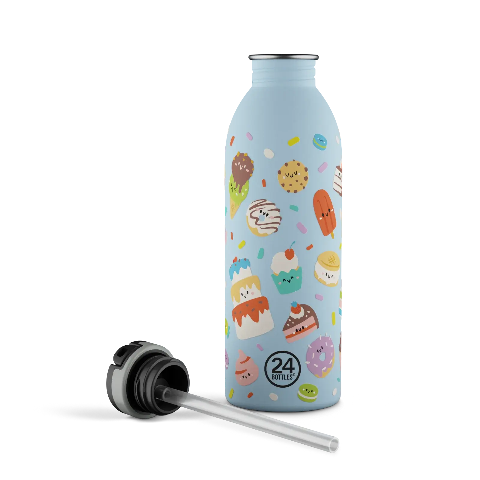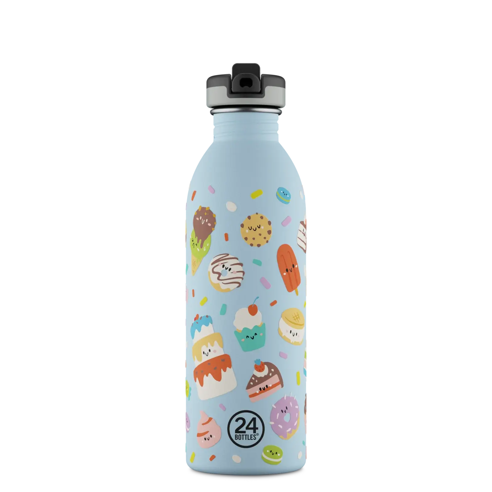 Met zijn mooie illustraties van taartjes, donuts en andere zoetigheid is deze enkelwandige drinkbus een topper bij kinderen. De zachte blauwe kleur en de levendige afbeeldingen maken het drinken nog leuker.