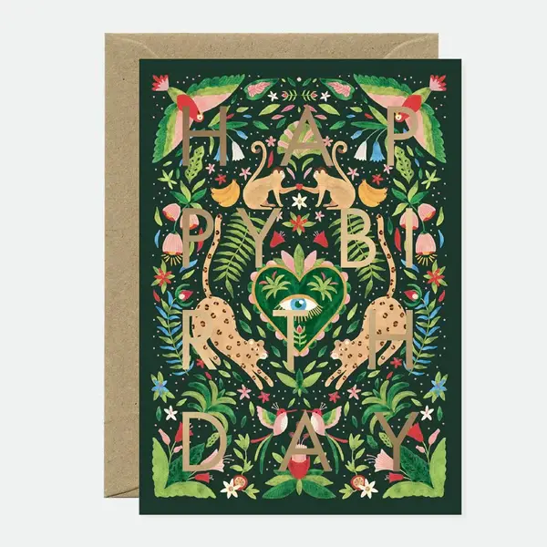 Deze wenskaart heeft een tekening van jungledieren en de tekst 'Happy birthday' in glanzende gouden letters. Een ideaal kaartje voor een verjaardag. De kaart is blanco vanbinnen zodat je er nog persoonlijke wensen kan bijschrijven.