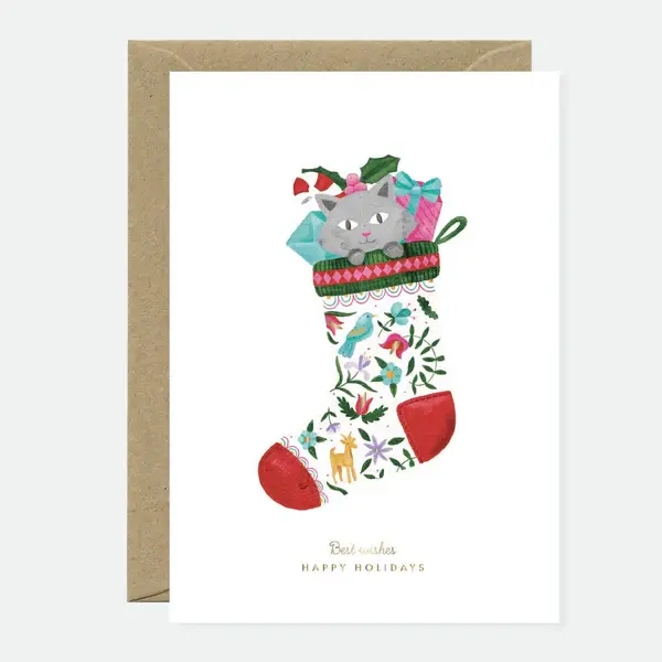 Deze wenskaart heeft een tekening van een schattig katje in een kerstsok. De kaart is blanco vanbinnen zodat je er je eigen wensen kan opschrijven. Ideaal om je persoonlijke kerstwensen per brief te versturen. Wie krijgt er nu niet graag post?