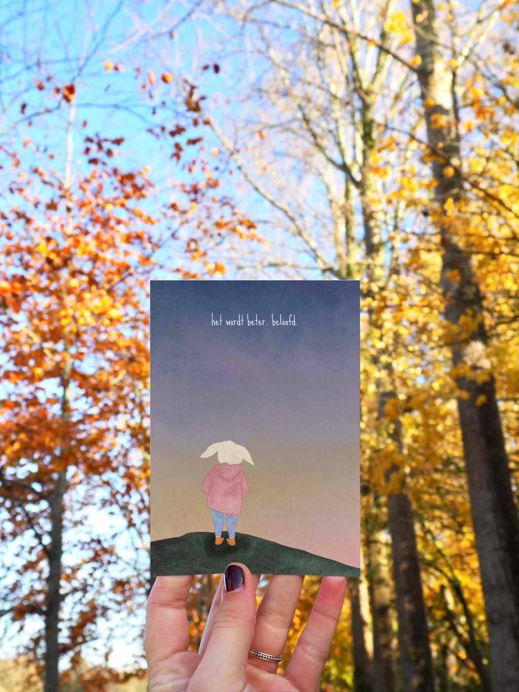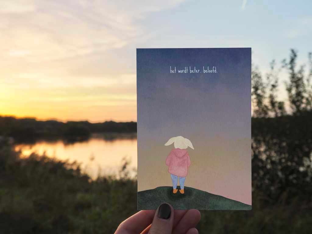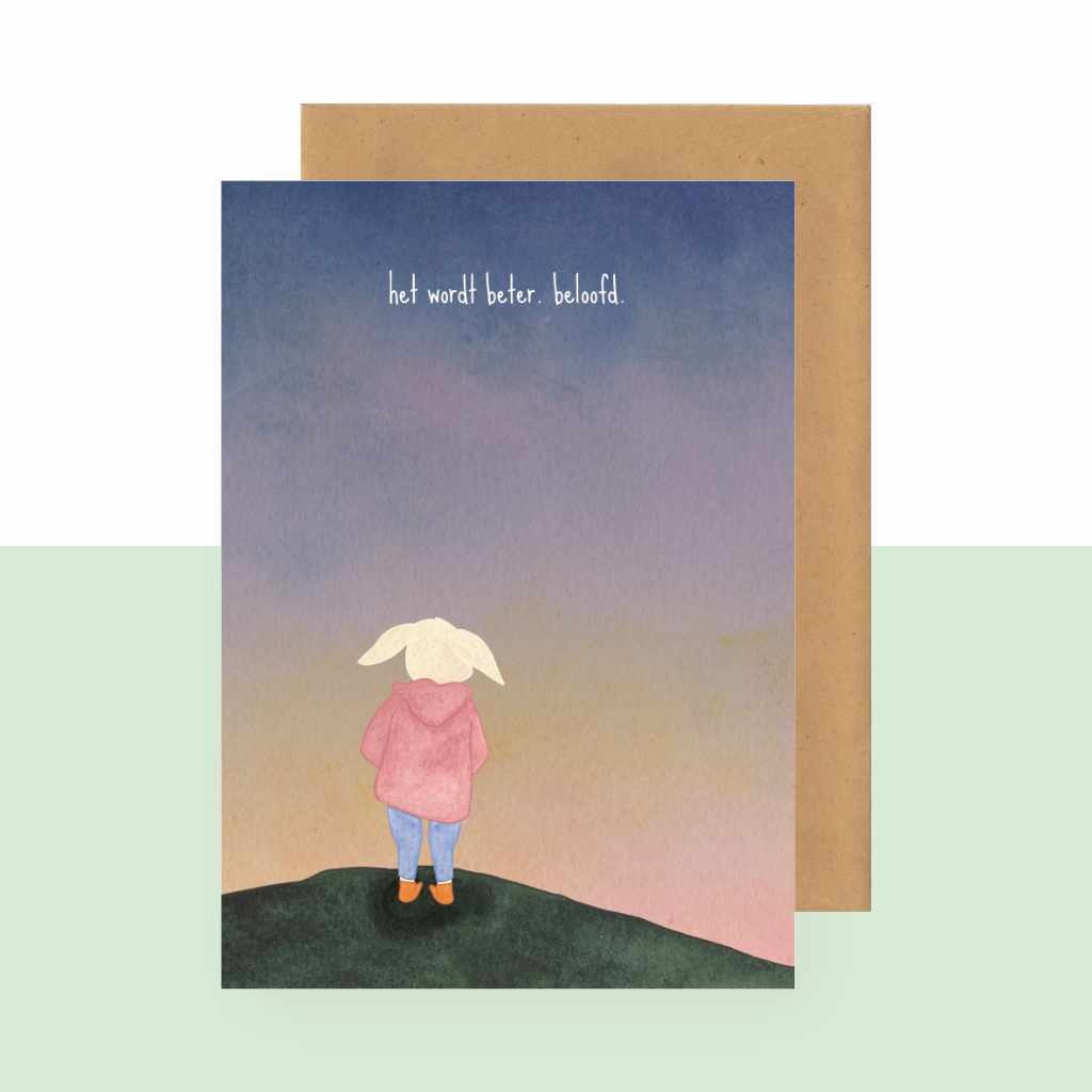 Deze wenskaart heeft de tekst 'Het word beter, beloofd' met een tekening van een geitje. Ideaal bij overlijden of verlies.