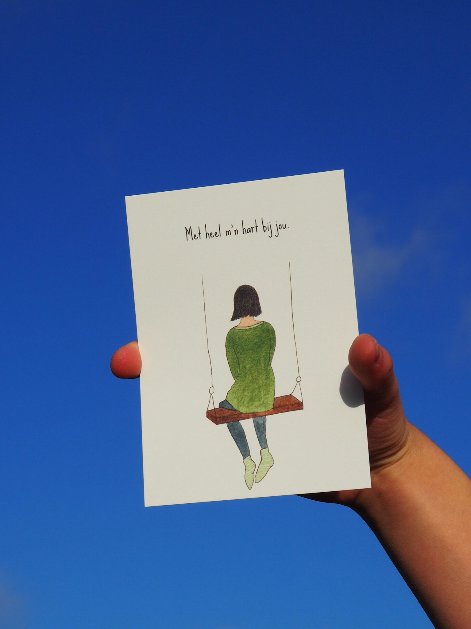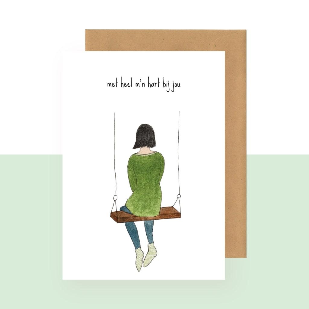 Deze wenskaart heeft de tekst 'Met heel mijn hart bij jou' met een tekening van een meisje op een schommel. Ideaal bij overlijden of verlies.