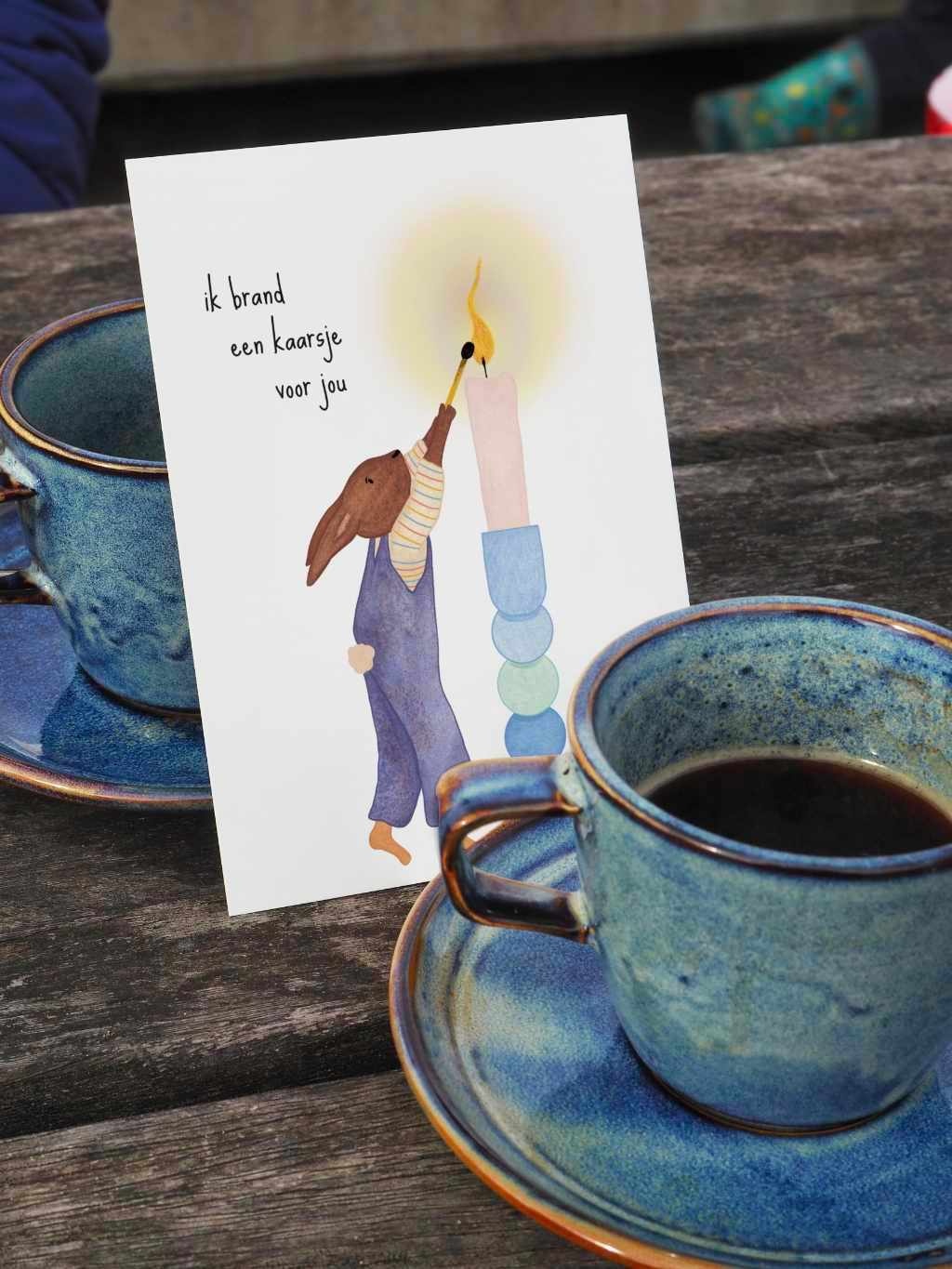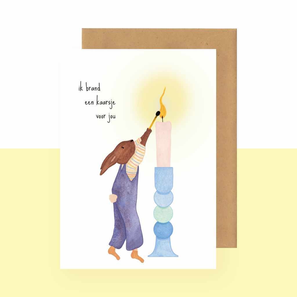 Deze wenskaart heeft de tekst 'Ik brand een kaartje voor jou' met een tekening van een konijntje. Ideaal bij overlijden of verlies.
