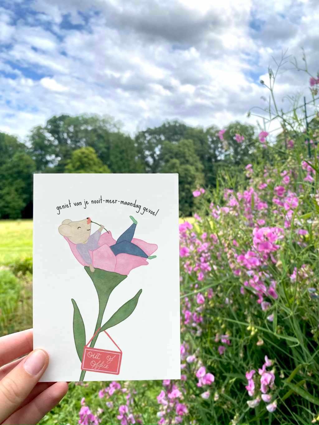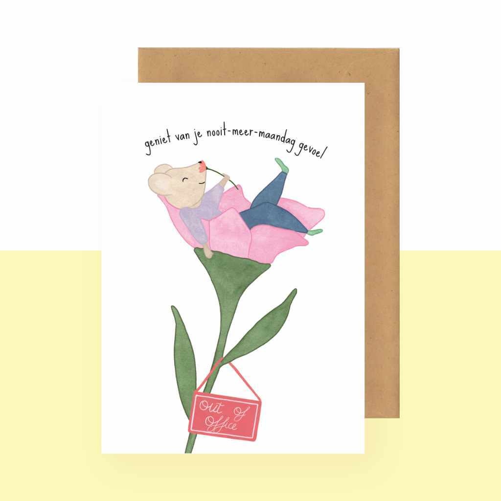 Deze leuke wenskaart heeft de tekst 'Geniet van je nooit-meer-maandag-gevoel' met een tekening van een muisje dat aan het chillen is in een bloem. Ideaal kaartje voor iemand die met pensioen gaat.