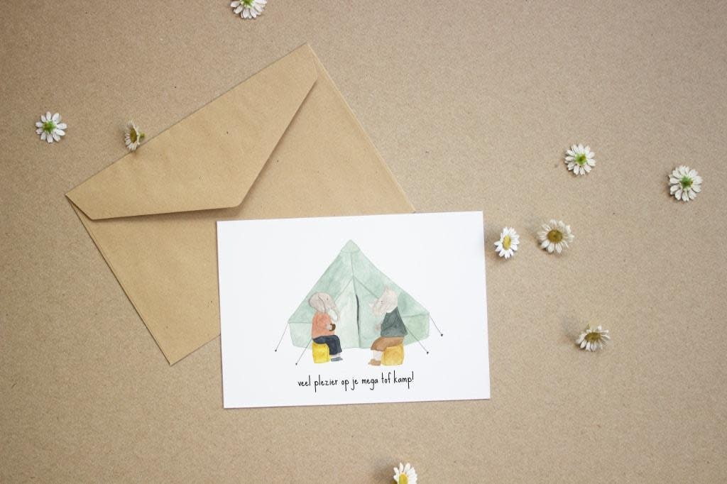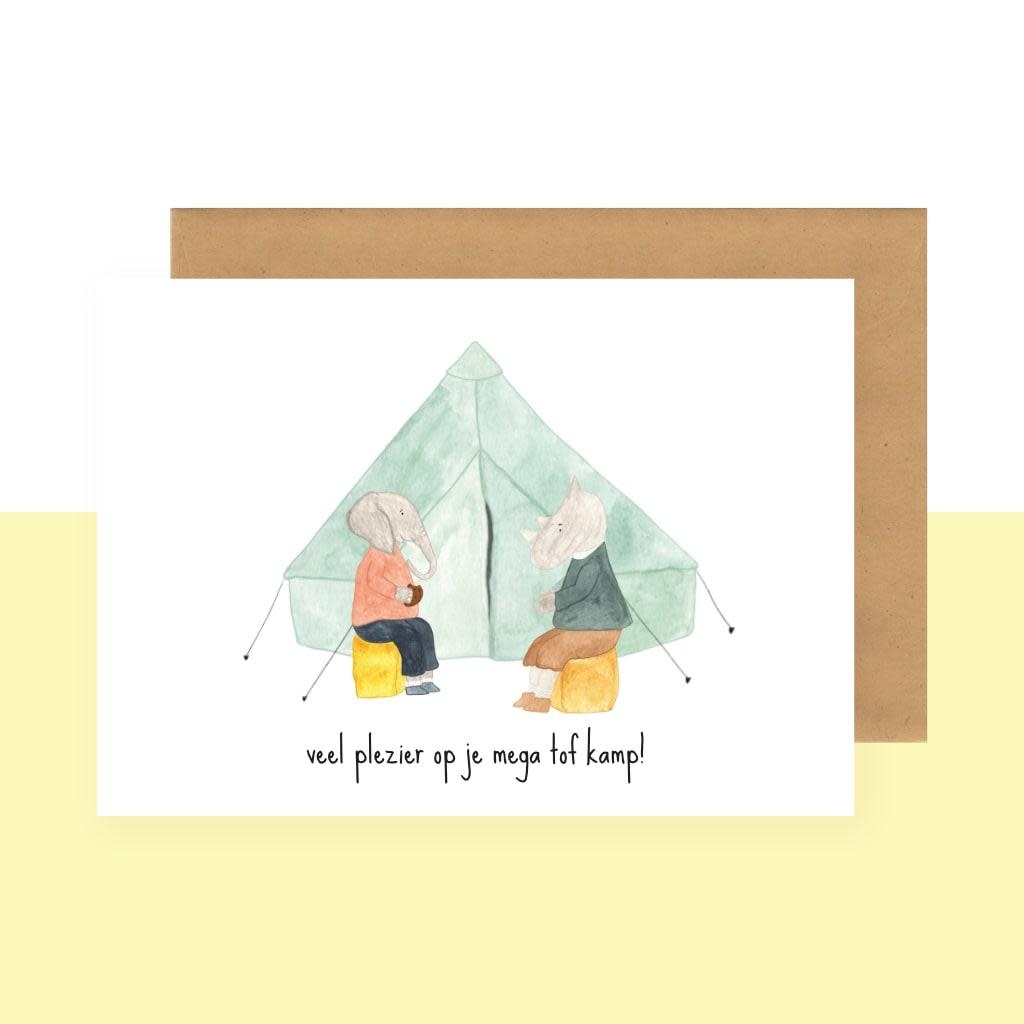 Deze leuke wenskaart heeft de tekst 'Veel plezier op je mega tof kamp' met een tekening van een neushoorn en olifant voor een tent. Ideaal voor als je kind, kleinkind,... op kamp is.