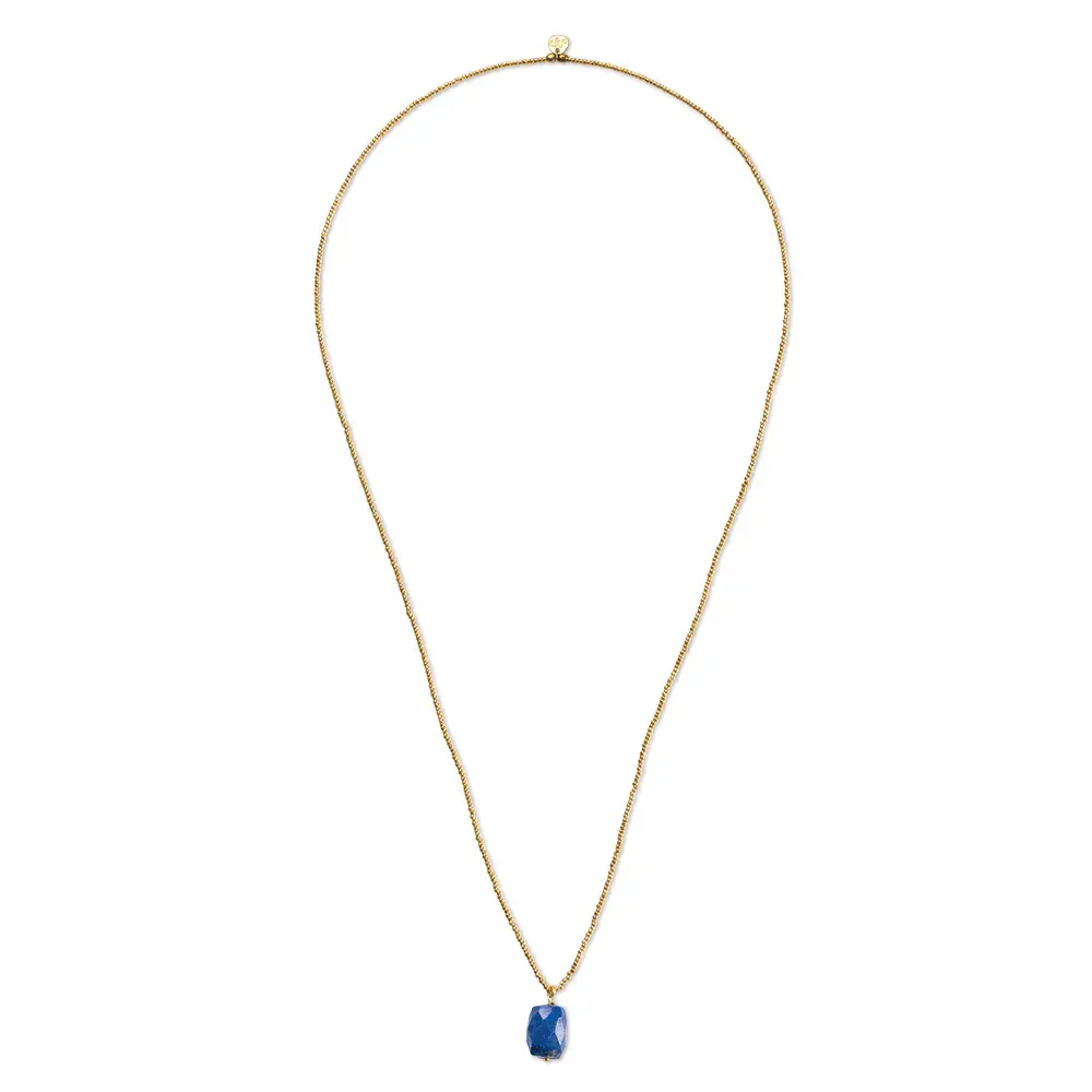 Deze goudkleurige ketting heeft als accent een lapis lazuli. De blauwe edelsteen staat voor vriendschap. De lange ketting meet 62 cm. Ze is gemaakt van glaskralen.