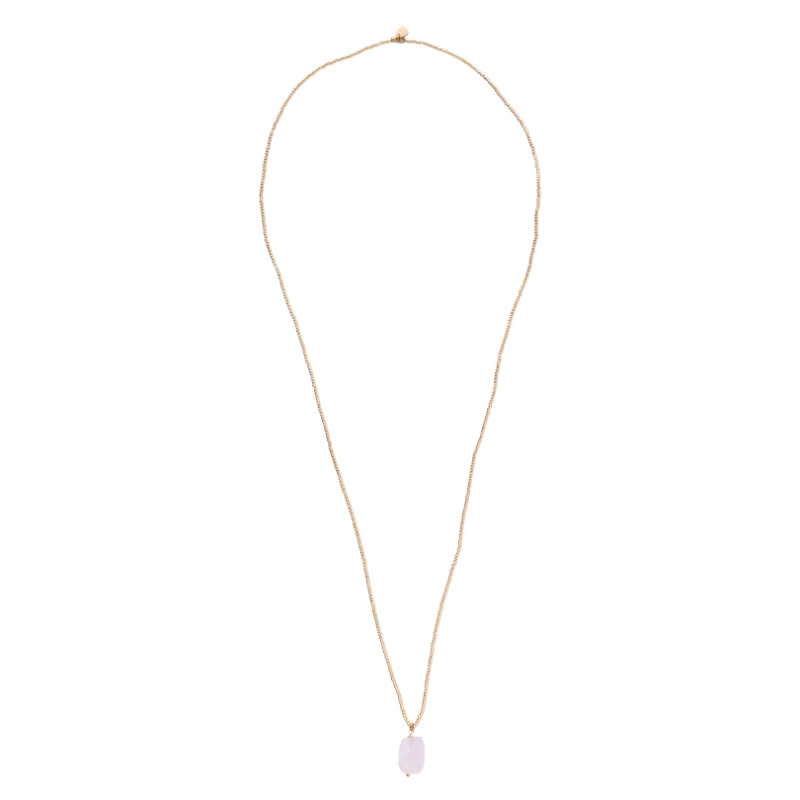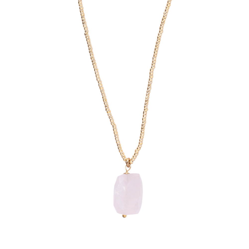 Deze goudkleurige ketting heeft als accent een rozenkwarts. De roze edelsteen staat voor liefde. De lange ketting meet 62 cm. Ze is gemaakt van glaskralen.
