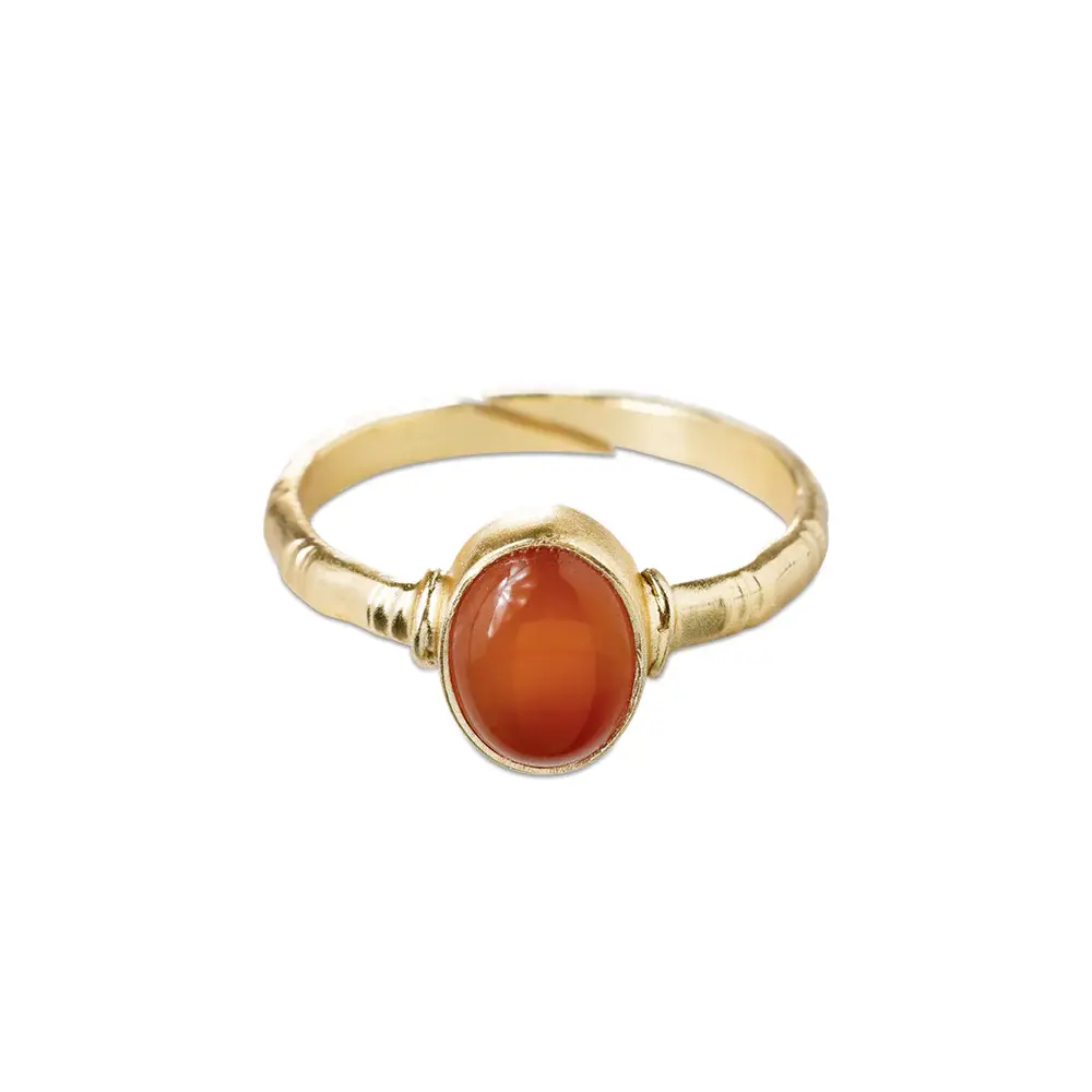 Goudkleurige ring met edelsteen in carnelian. Carneool staat voor moed. Hij is aanpasbaar en past dus bijna iedereen.