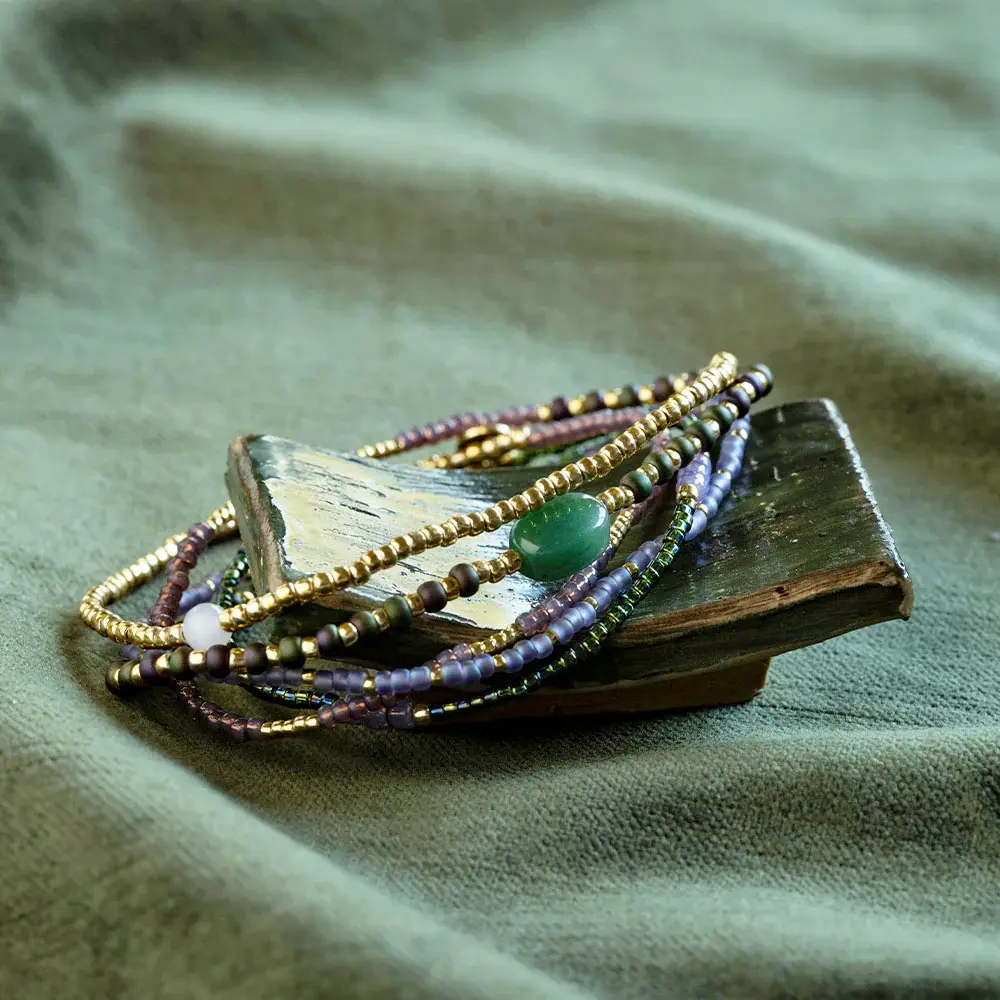 Deze kralenarmband heeft als accent aventurijn en rozenkwarts. De groene edelsteen staat voor motivatie en persoonlijke groei. De roze edelsteen staat voor liefde. De armband wikkel je 5 keer om je arm. Hij rekt mee en past rond bijna elke pols.