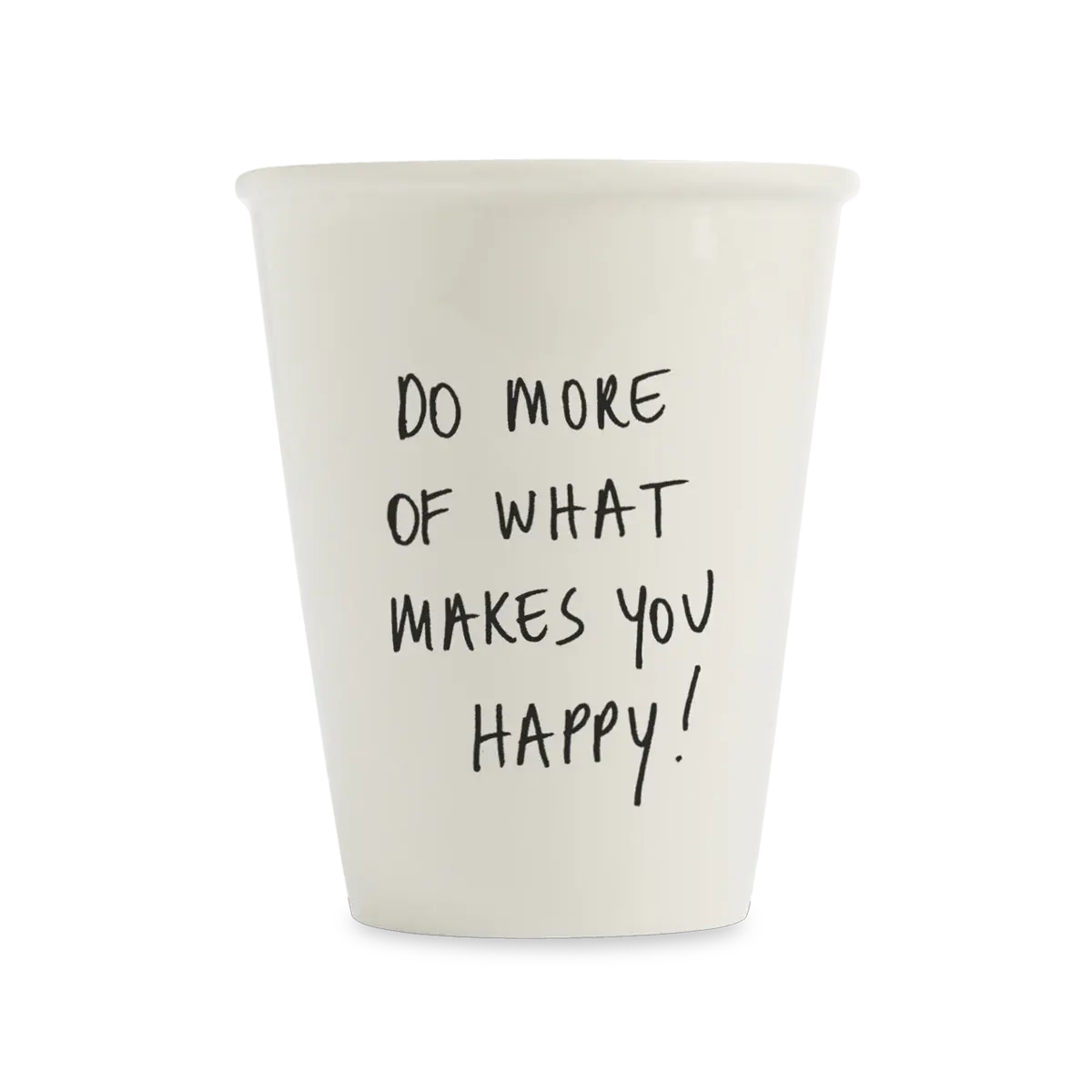 Deze witte beker heeft als illustratie de tekst 'Do more of what makes you happy'. Aan de binnenkant van de beker knipoogt een hartjes-smiley naar je terwijl je drinkt.