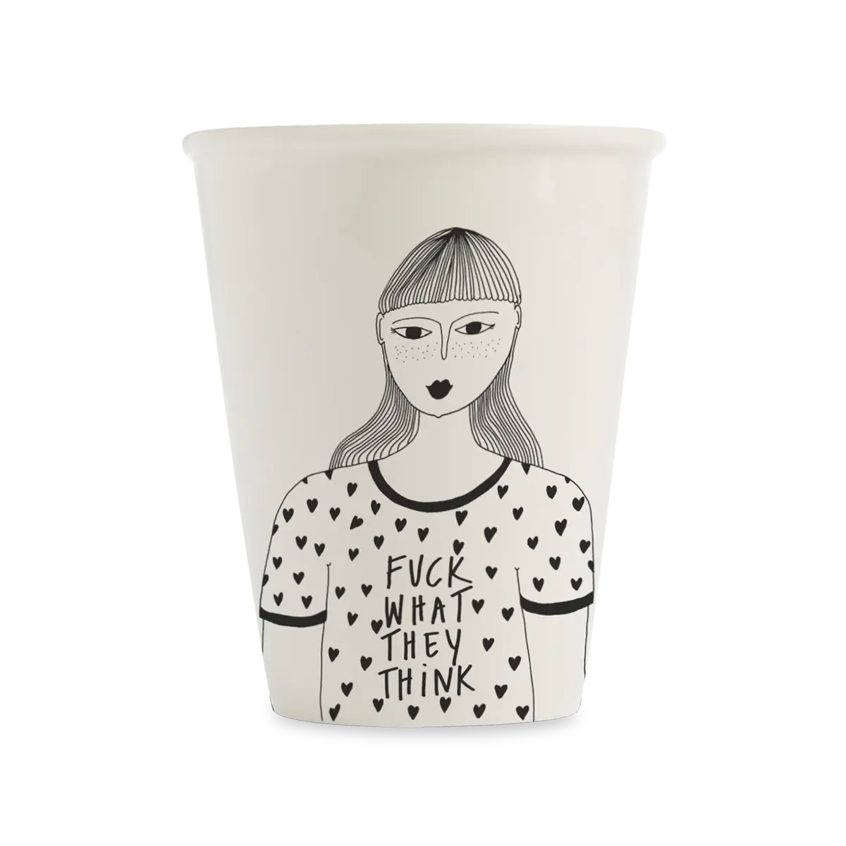Deze witte beker heeft als illustratie de tekening 'F*ck what they think'.