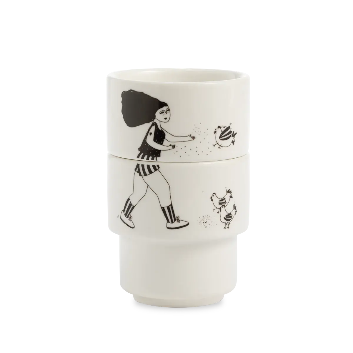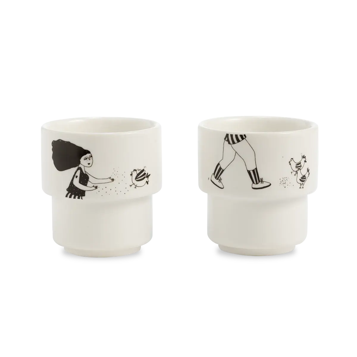 Je combineert de eierdopjes makkelijk met de rest van de collectie, zoals bijvoorbeeld de koffiebekers. Alles past mooi bij elkaar met de typische zwarte lijntekeningen op witte achtergrond. Ontdek het hele Helen b. universum hier.