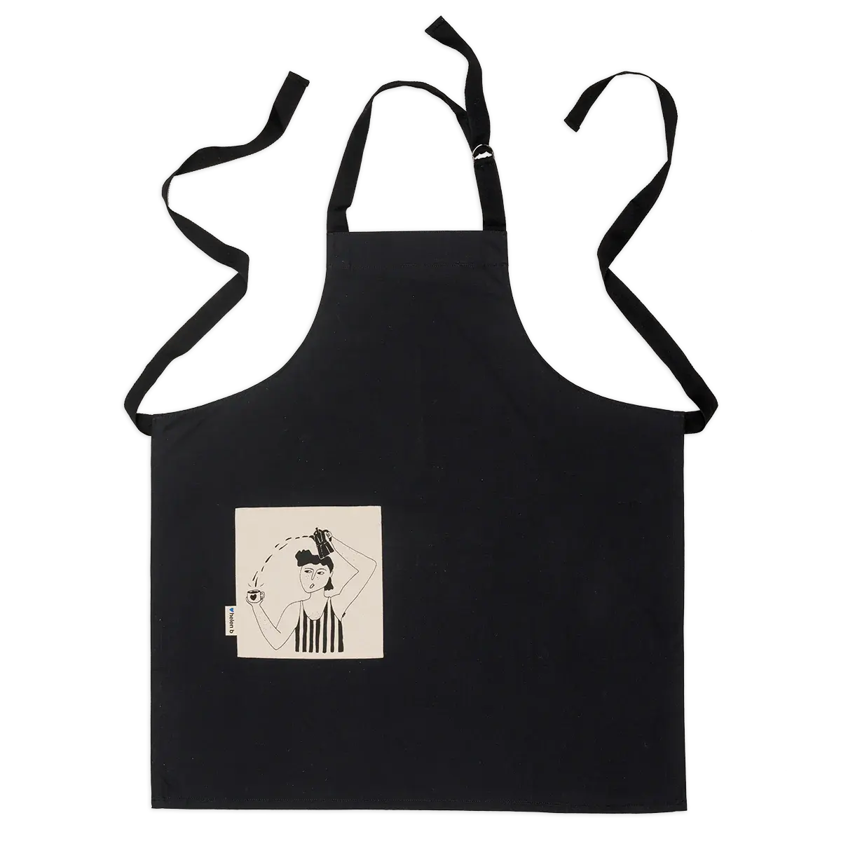 Deze zwarte schort heeft de Helen b. illustratie 'Vic and his Bialetti'. Hij heeft een verstelbare riem. Zo kan je de lengte makkelijk aanpassen. Vooraan zit een handig wit zakje waar de illustratie op geprint is.