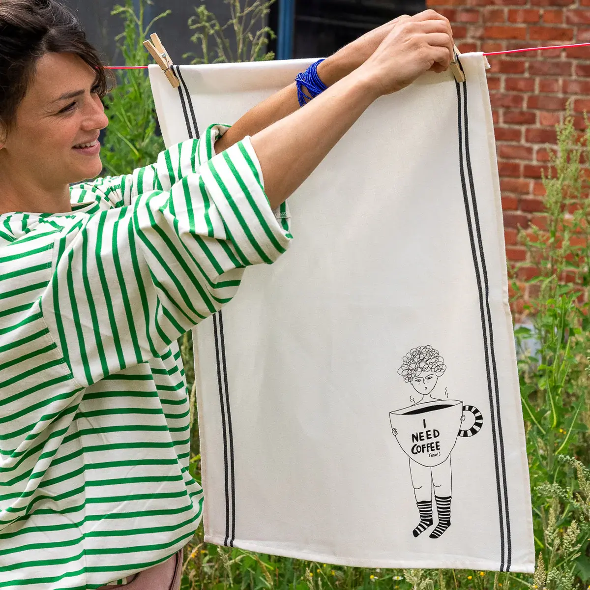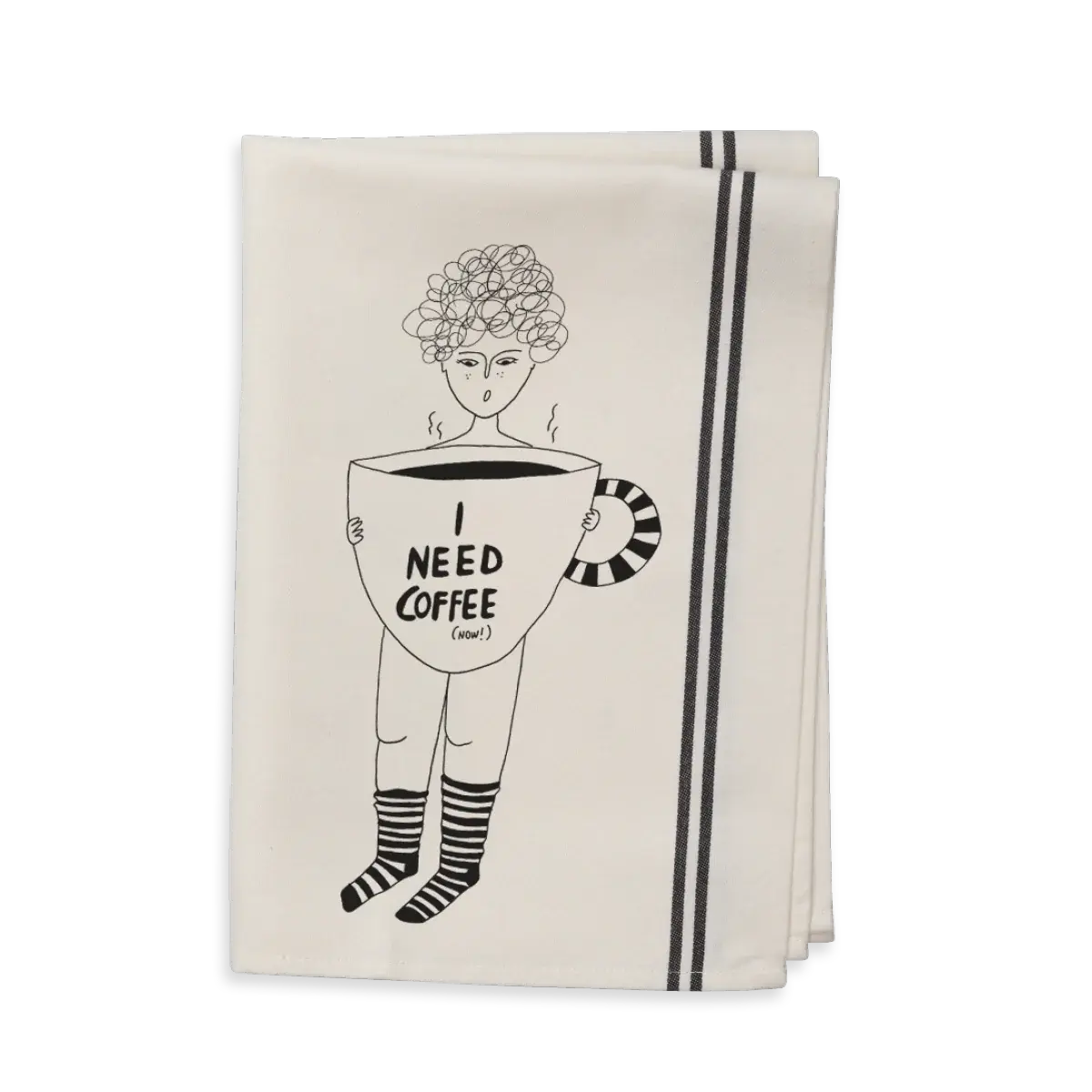 Leuke theedoek met illustratie van Helen b. Deze illustratie 'Coffee now' is een tekening van een coffee addict. Een leuk cadeautje met een knipoog naar mensen die heel erg veel van koffie houden. Deze keukenhanddoek krijgt zeker een leuk plaatsje in jouw keuken.