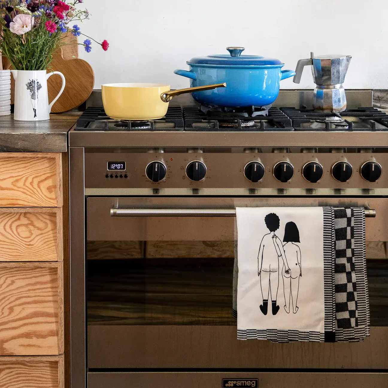 Deze set bevat 2 katoenen keukenhanddoeken. Op 1 ervan staat de illustratie 'Naked couple back'. De andere is zwart geblokt. Deze keukenhanddoeken krijgen zeker een leuk plaatsje in jouw keuken.