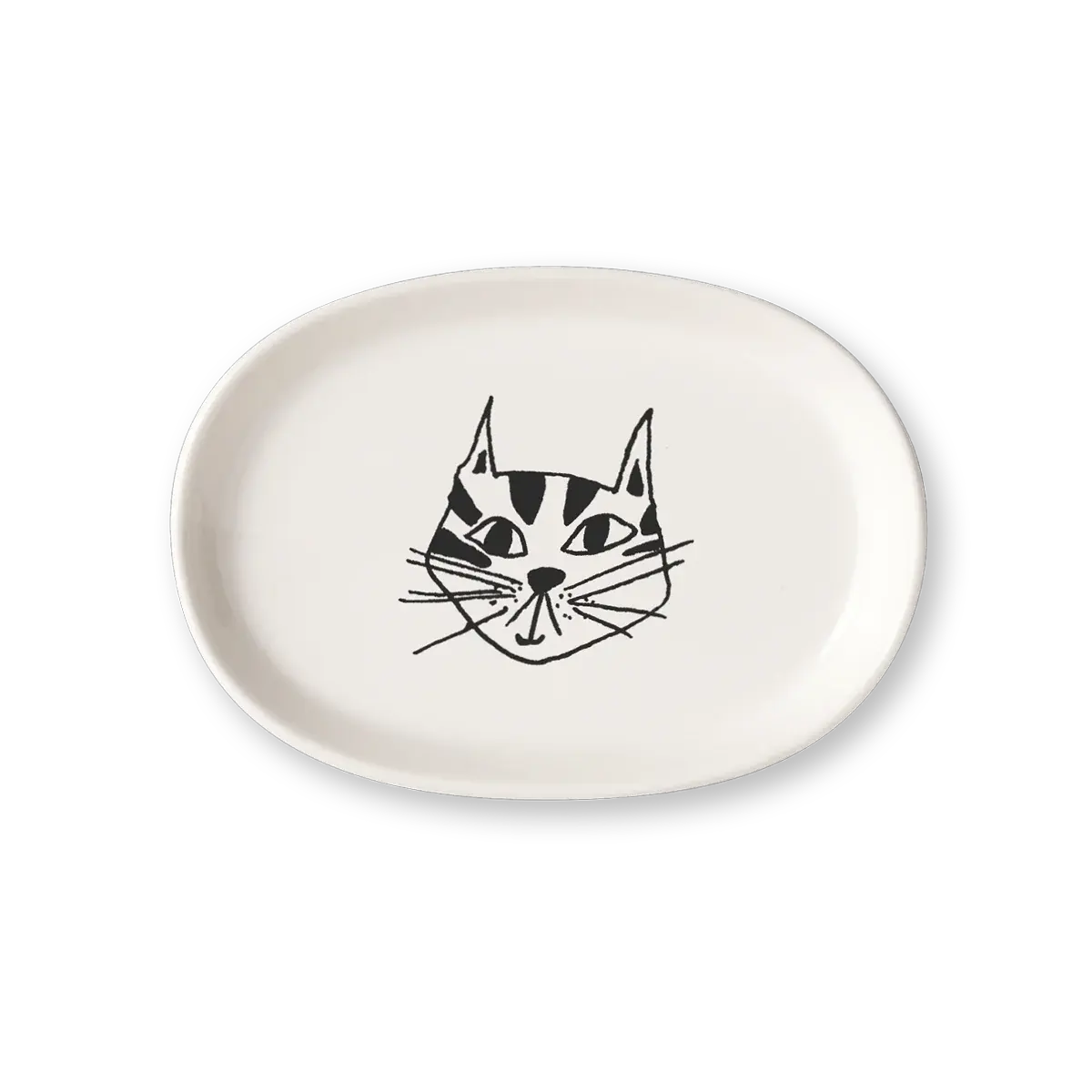 Op dit witte schaaltje met zwarte illustratie van Helen b. staat de tekening 'Kitty', en schattig poesje.