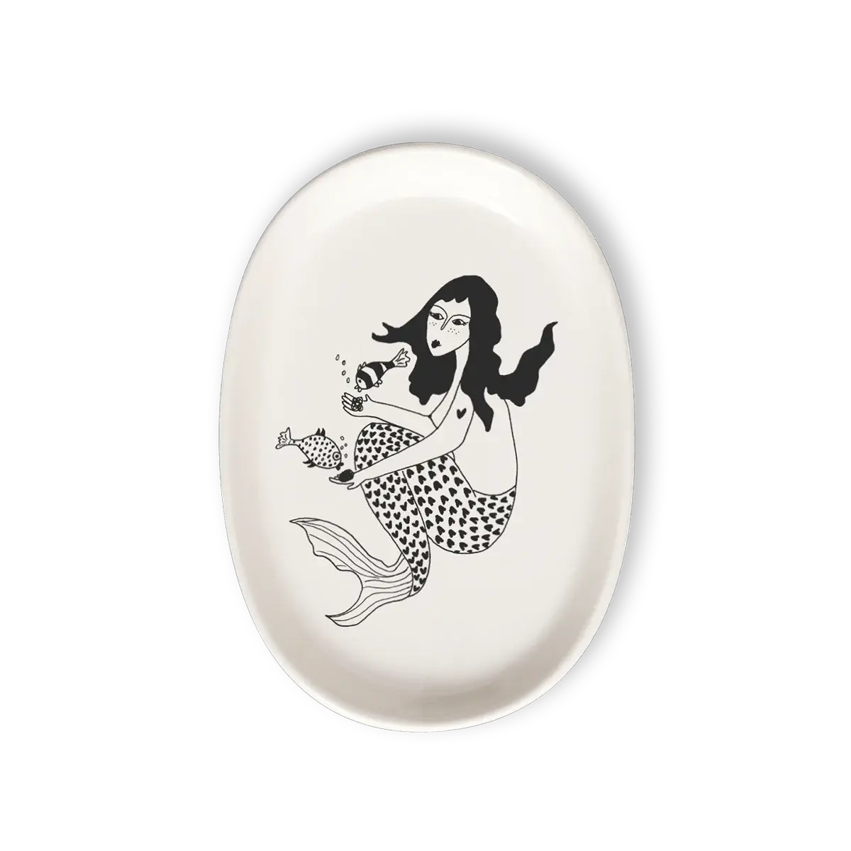 Op dit witte schaaltje met zwarte illustratie van Helen b. staat de tekening 'Mermina', een mooie zeemeermin.