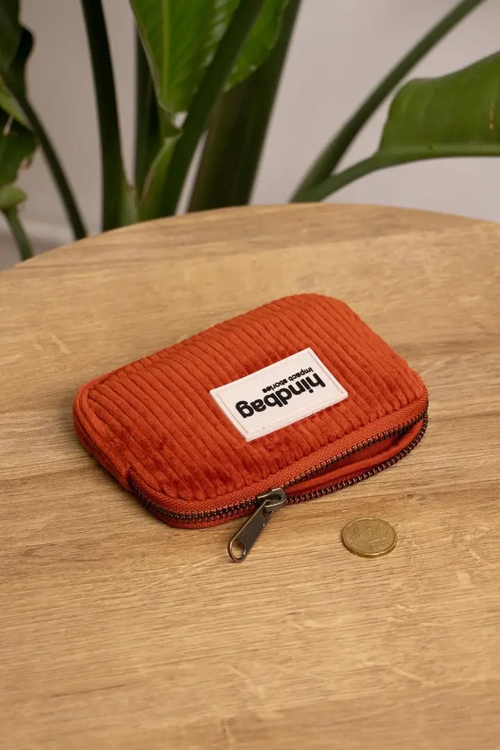 Deze oranje ribluweel mini portemonnee met rits is perfect voor al je essentials. Stop er je identiteitskaart, rijbewijs en (klein)geld in. De portefeuille is compact, zodat ze niet teveel plaats inneemt in je tas of zak. De zachte velours stof in kleur 'Brique' past perfect bij de rest van de Hindbag-collectie.