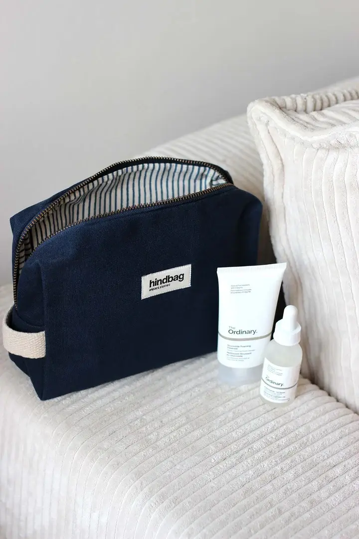 Deze mooie toilettas is ideaal voor al je essentials tijdens een weekendje weg, op reis of vakantie of na het sporten. Stop er je toiletspullen, make-up, shampoo en tandenborstel in. De donkerblauwe kleur 'Marine' past perfect bij de rest van de Hindbag-collectie. De binnenkant van de toilettas heeft een mooie voering met print.