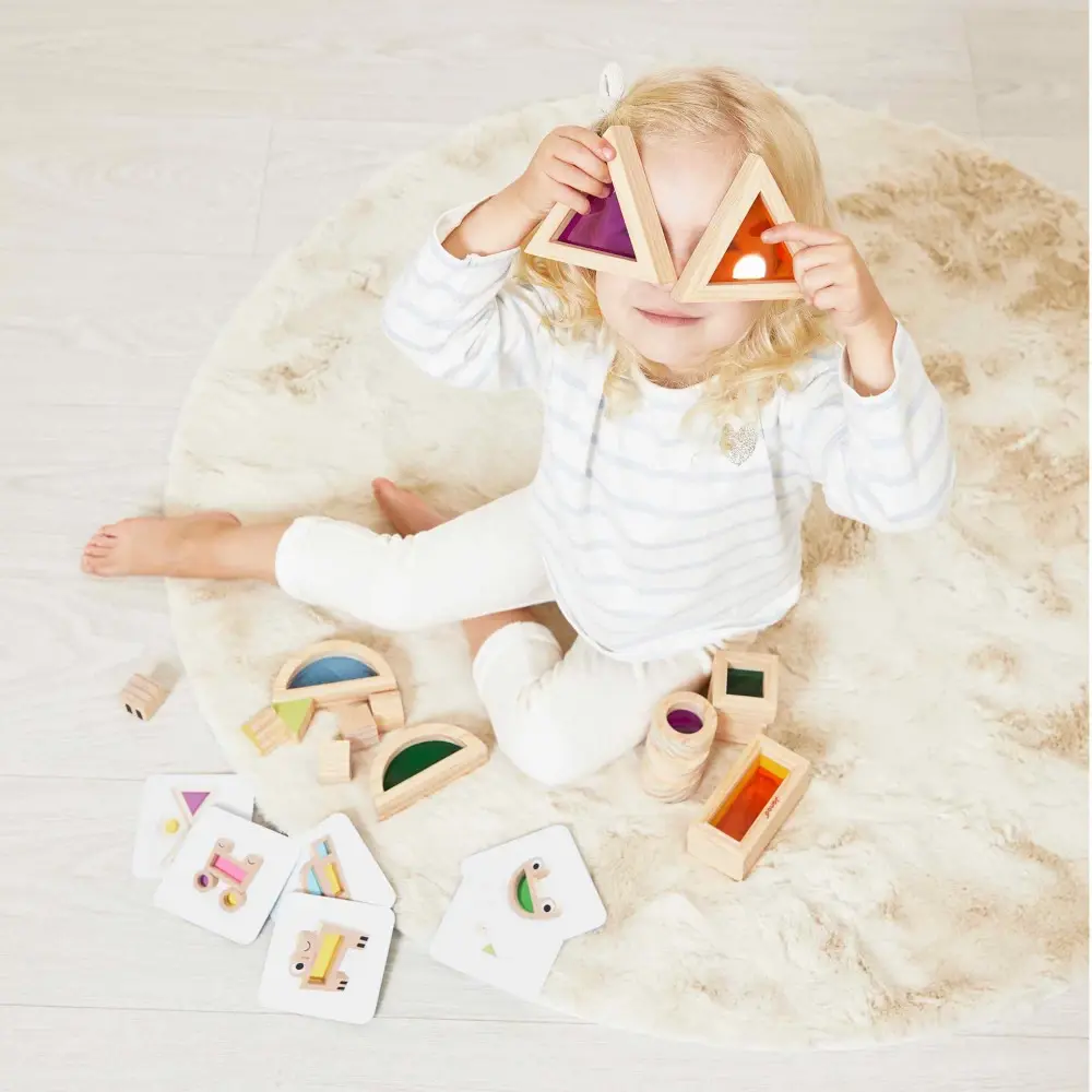 Open ended play vraagt om setjes zoals deze sensorische blokken. De doorzichtige, kleurige blokken geven je kindje meteen een kleurrijk zicht op het leven.