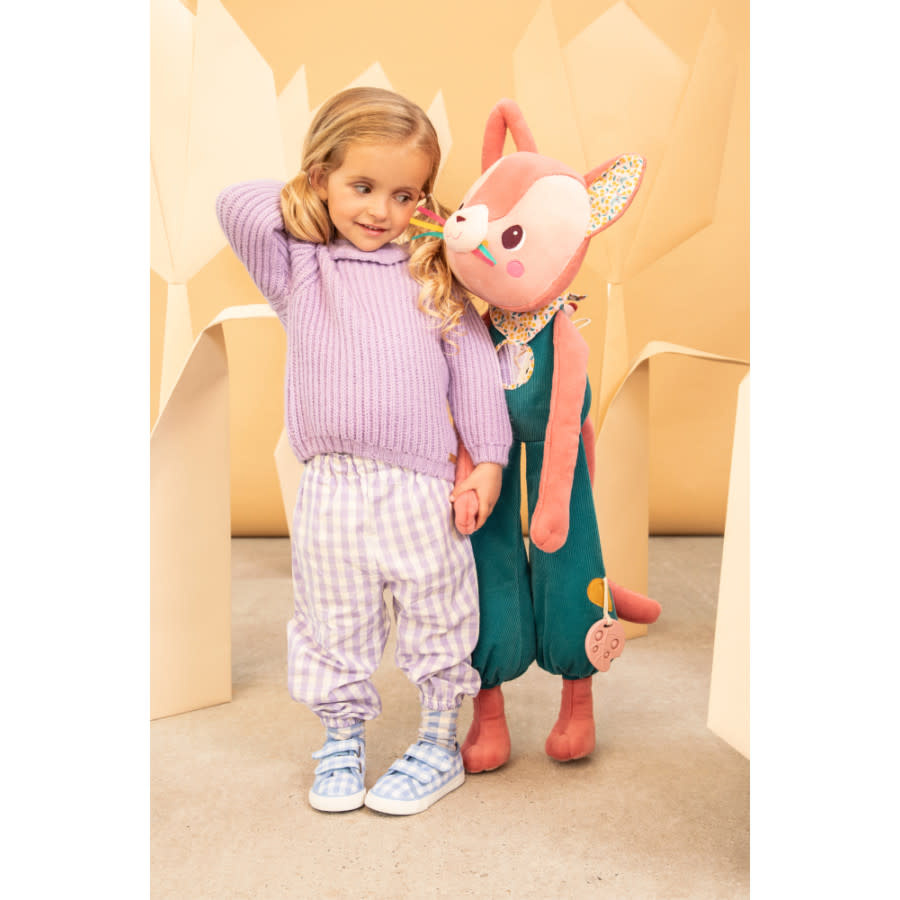 Jeanne heeft allerlei leuke accessoires om aan te prutsen en friemelen. Zo ontwikkel je de auditieve en motorische vaardigheden van je kind. Bovendien is ze ook decoratief in de kinderkamer.