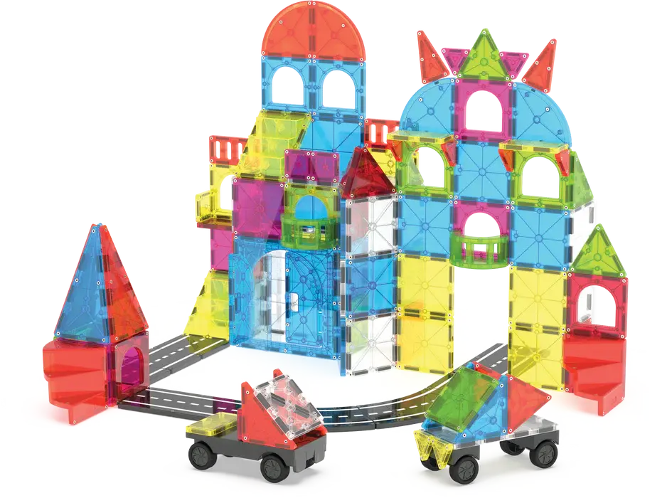 Deze City Center set bevat 1110 magnetische onderdelen, waaronder wegdelen, wenteltrappen, klassieke trappen, balkons, hekken, microMAGS en een chassis met wielen en assen om jouw stad tot leven te brengen.