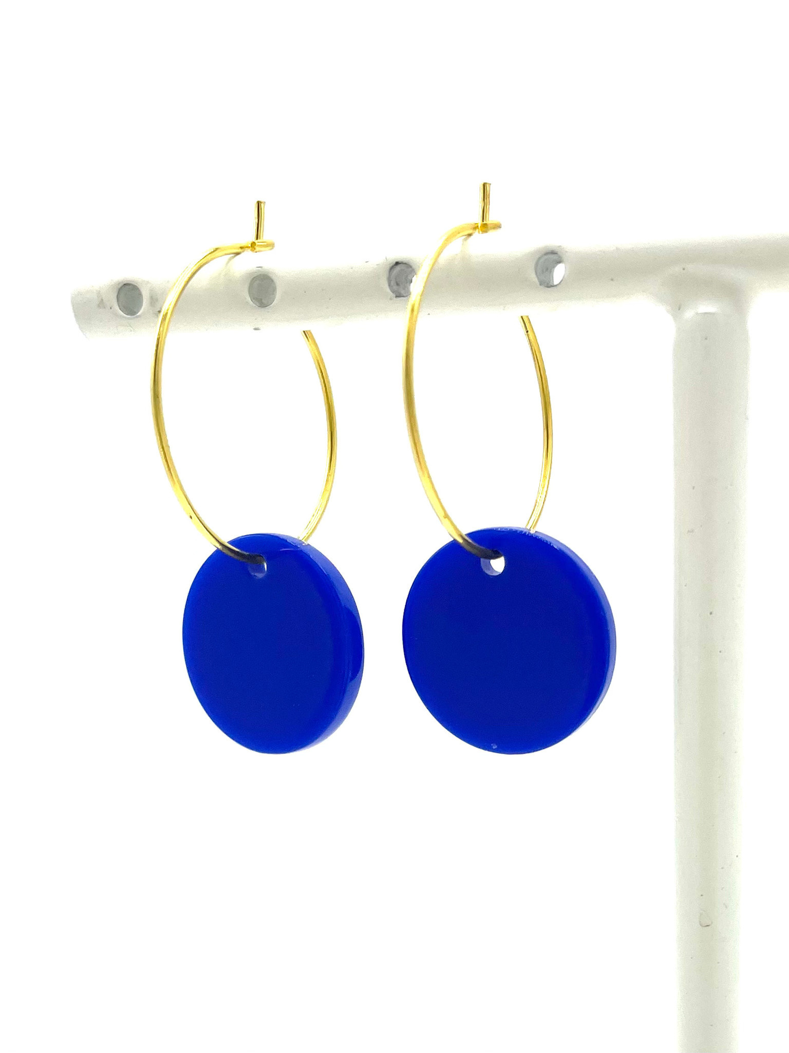 Deze goudkleurige creolen hebben een een blauwe cirkel als hanger. Combineer met een bijpassende ketting voor nog meer effect.