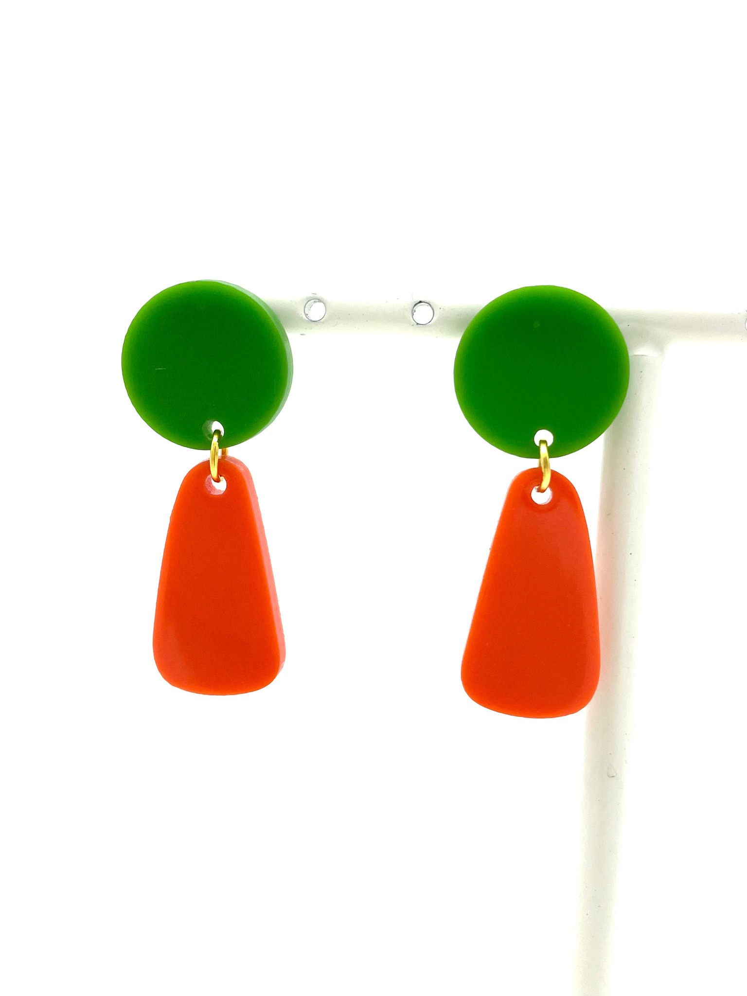 Deze oorringen bestaan uit een groen cirkeltje met daaronder een hanger in oranje. Combineer met een bijpassende ketting voor nog meer effect.