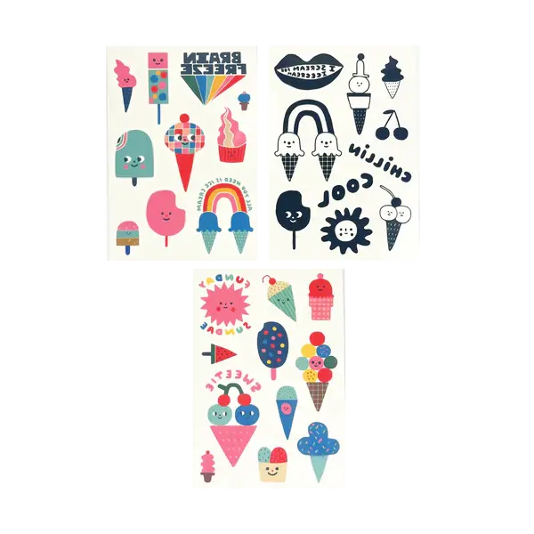 Leuk setje met 3 vellen temporary tattoos voor kinderen. De tatoeages hebben het thema 'ice cream': allemaal leuke ijsjes dus.