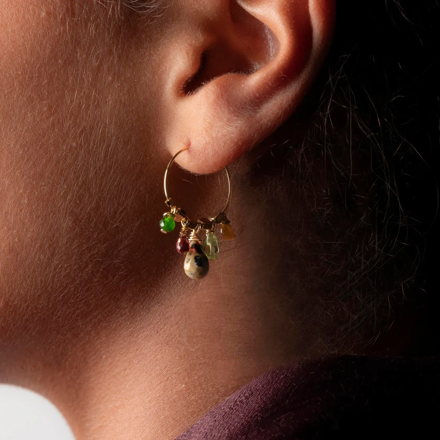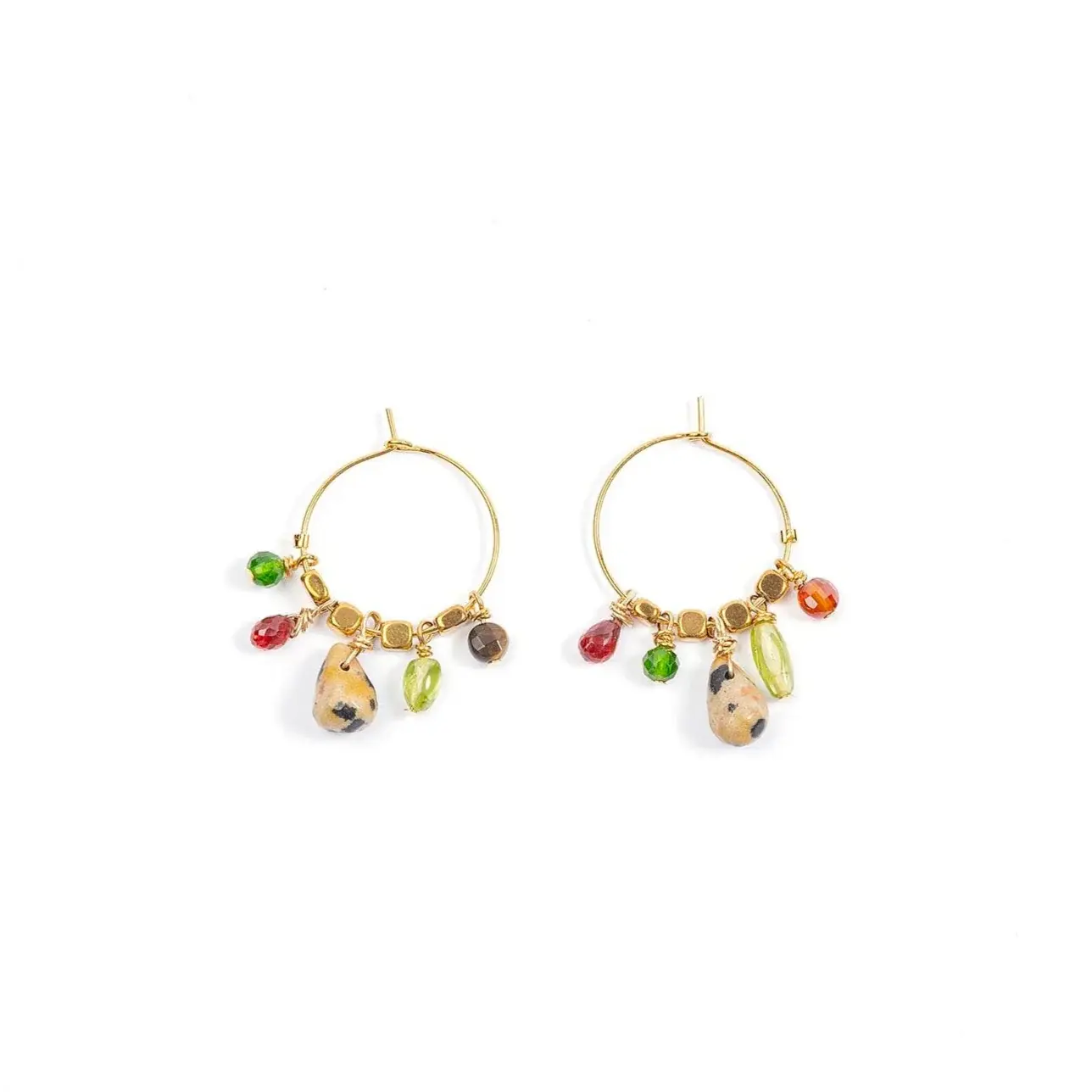 Dit paar aymmetrische oorringen in verguld staal heeft gespikkelde en bordeaux granaat edelstenen als accent. De oorhangers met jade en zirconium hebben een diameter van 18 mm.