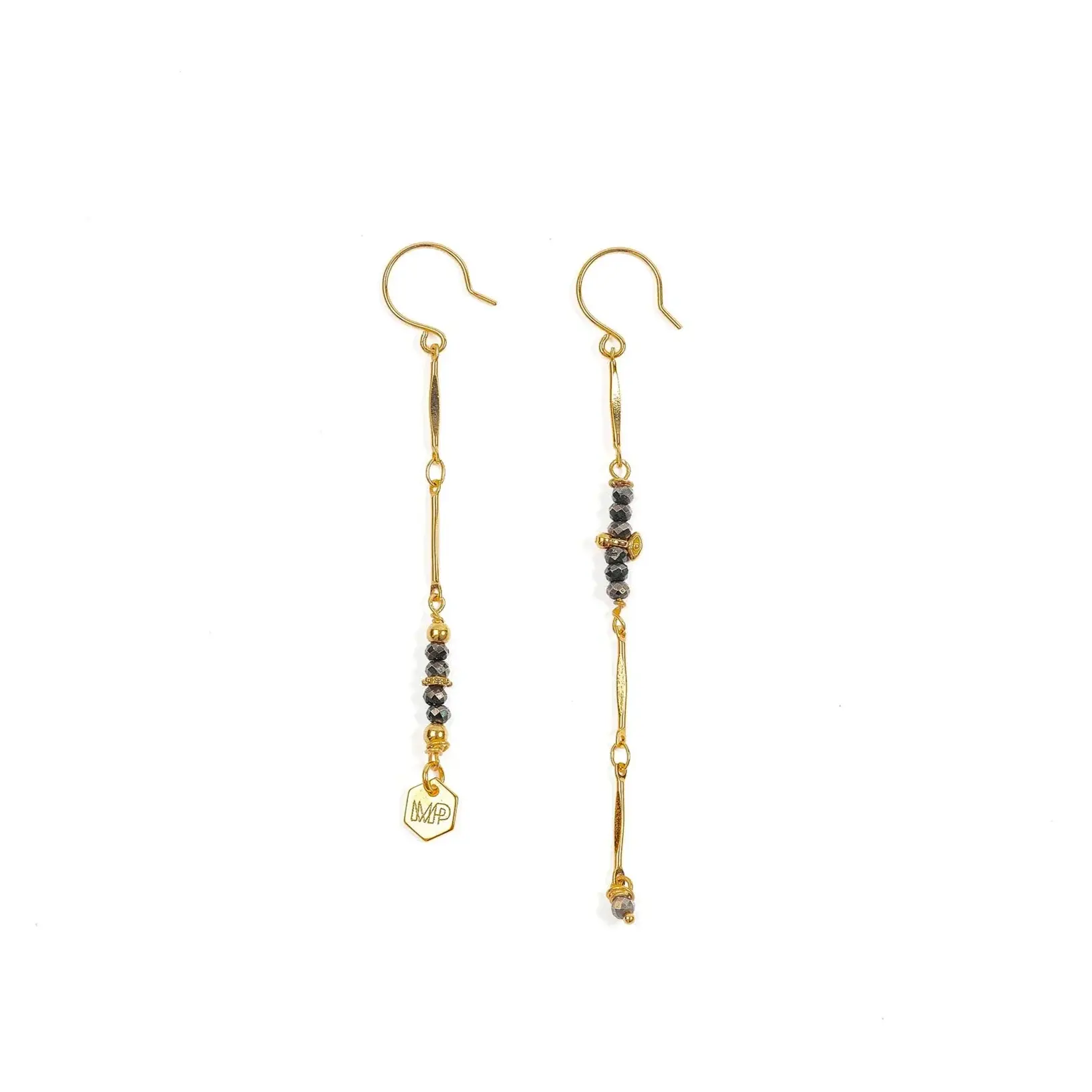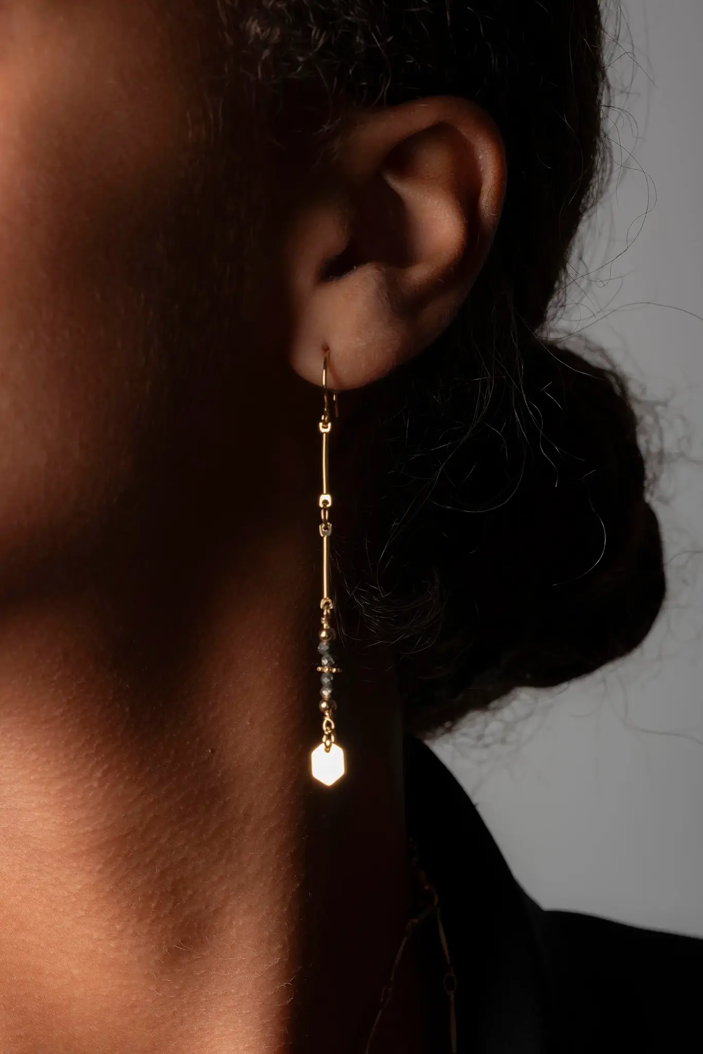 Dit paar asymmetrische oorringen in verguld staal heeft als accent kleine edelstenen pyriet. De oorhangers met edelstenen zijn 7 en 8,5 cm lang.