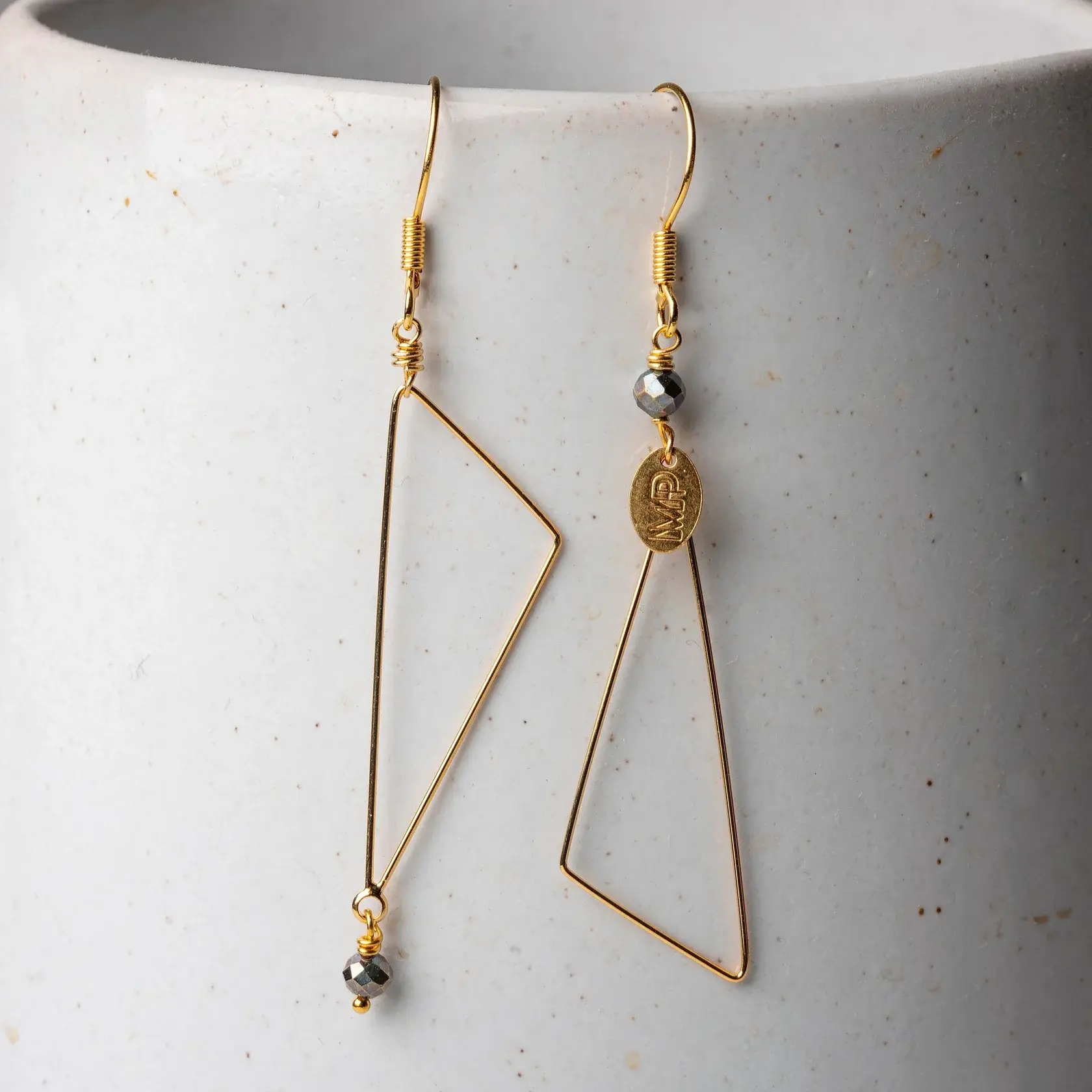 Dit paar van 2 verschillende oorringen in verguld messing is afgewerkt met grijze halfedelstenen pyriet. Ze hebben allebei een driehoek als accent. De oorringen zijn 8 cm lang.