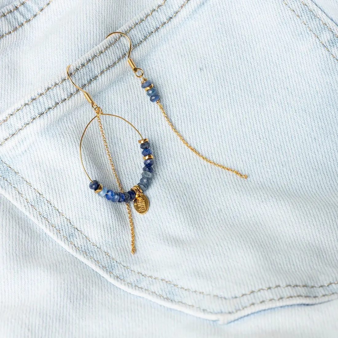 Dit paar van 2 verschillende paarse oorringen in verguld staal heeft cyaniet steentjes in verschillende tinten blauw als accent. De ene oorring heeft een kleine creool met ketting, de andere heeft enkel een ketting met steentje. De creool heeft een diameter van 3 cm, de oorringen zijn 8 cm lang.