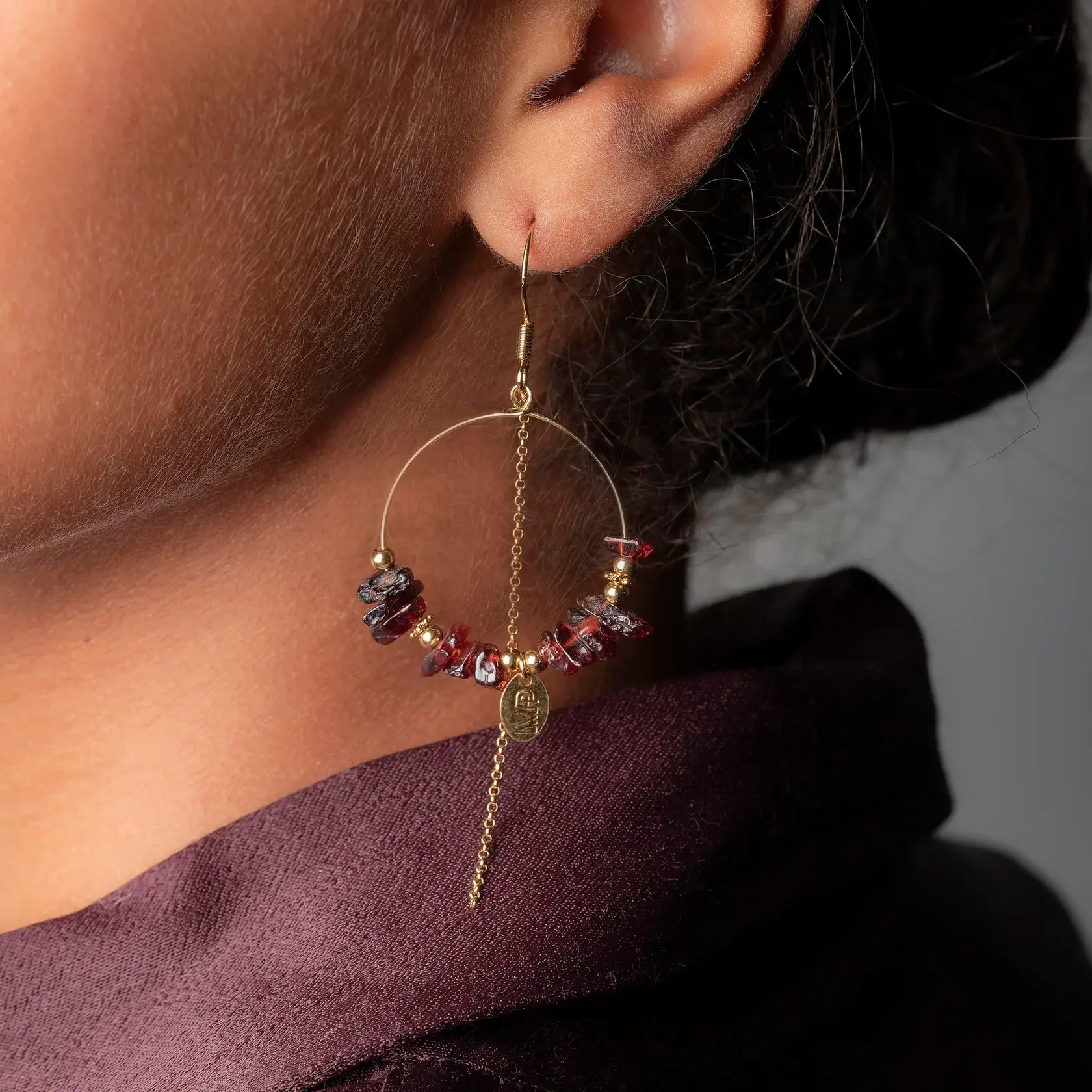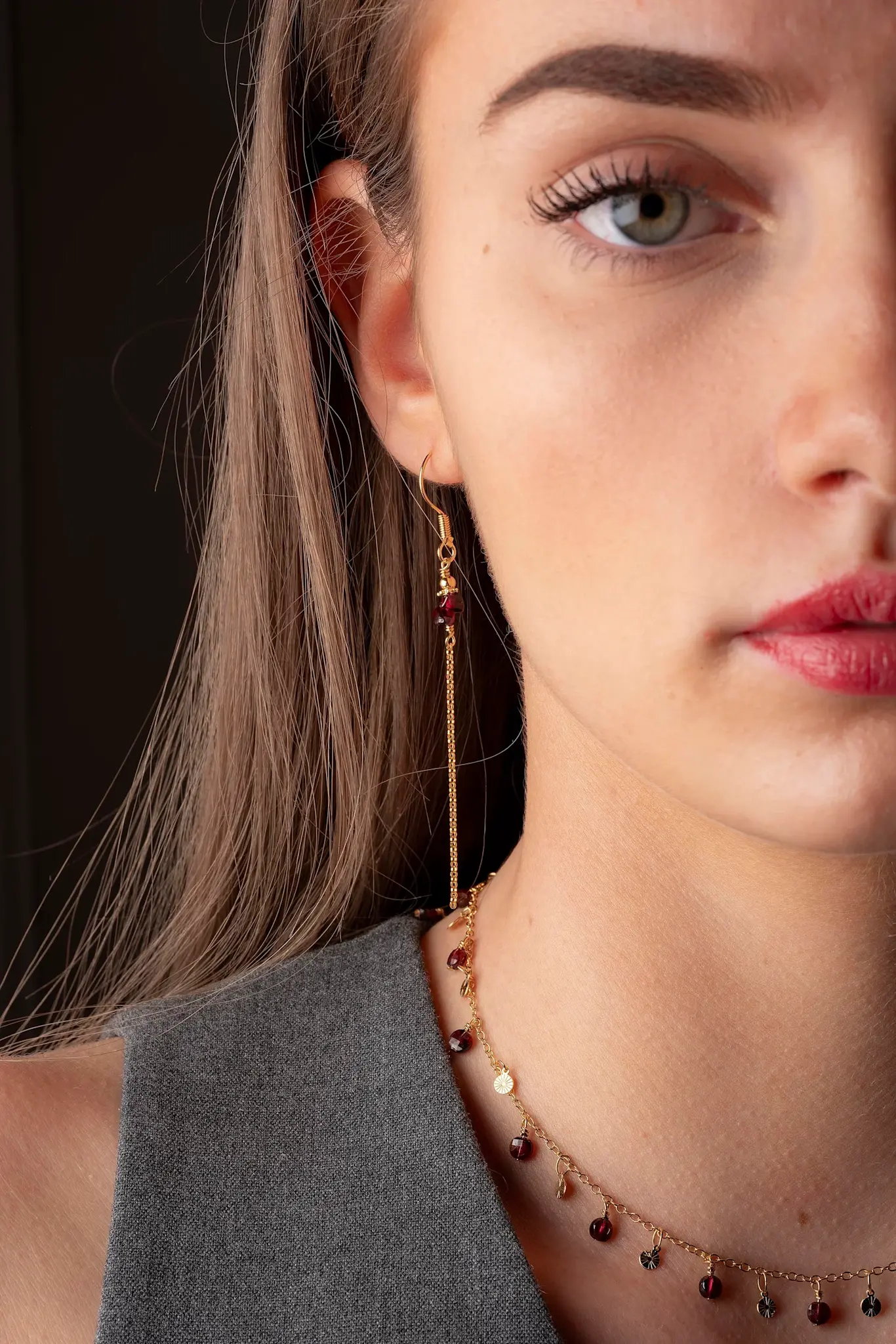Dit paar van 2 verschillende oorringen in verguld staal is afgewerkt met halfedelstenen van granaat. De ene oorring heeft een creool met steentjes en ketting, de andere heeft een ketting met steentjes in bordeaux. De creool heeft een diameter van 3 cm, de oorringen zijn 8 cm lang.
