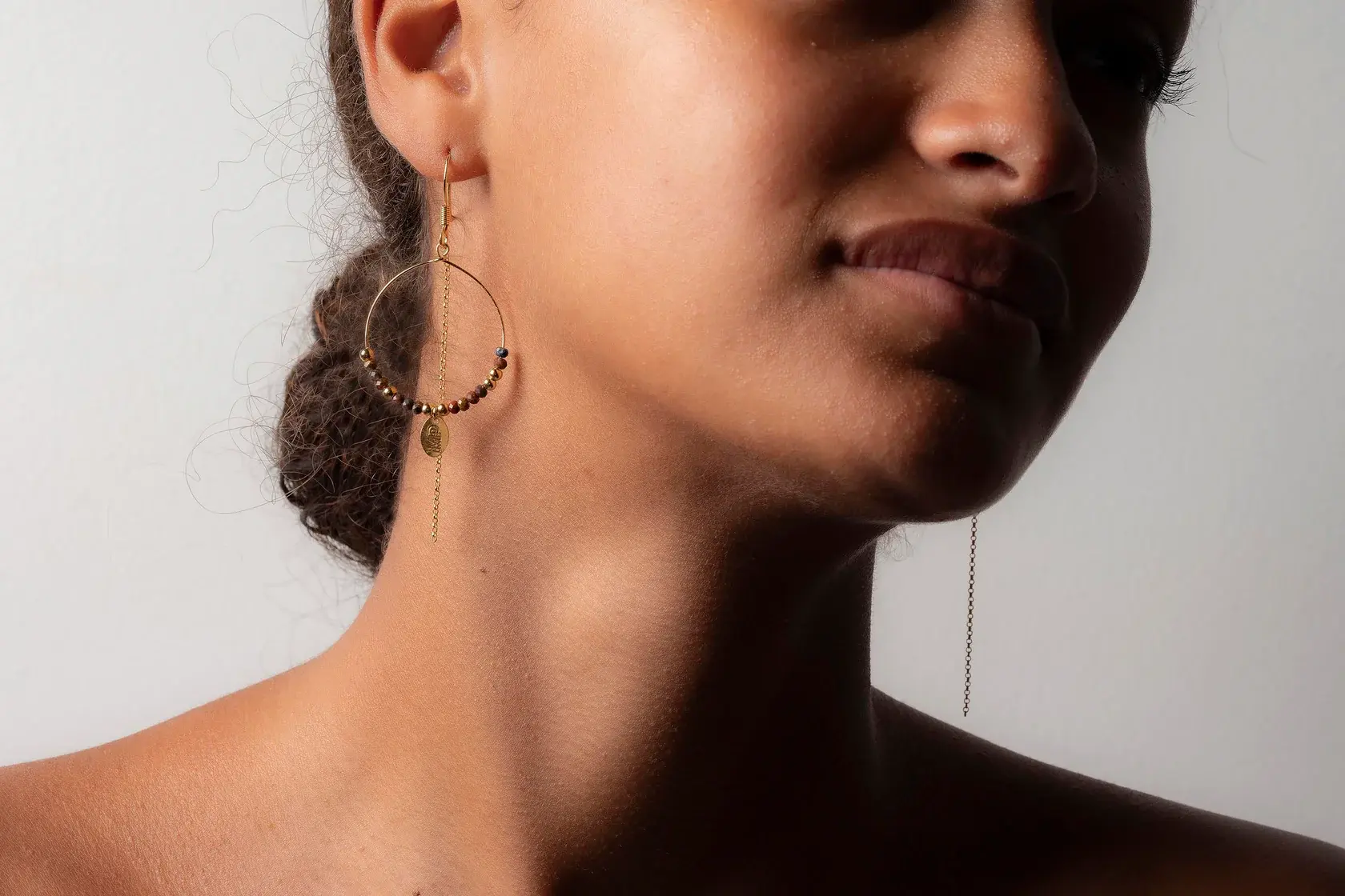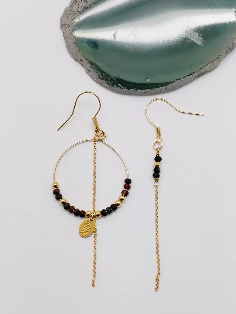 Dit paar van 2 verschillende oorringen in verguld staal is afgewerkt met rode en bordeaux halfedelstenen van pietersiet. De ene oorring heeft een creool met steentjes en ketting, de andere heeft een ketting met steentjes in bordeaux. De creool heeft een diameter van 3 cm, de oorringen zijn 8 cm lang.