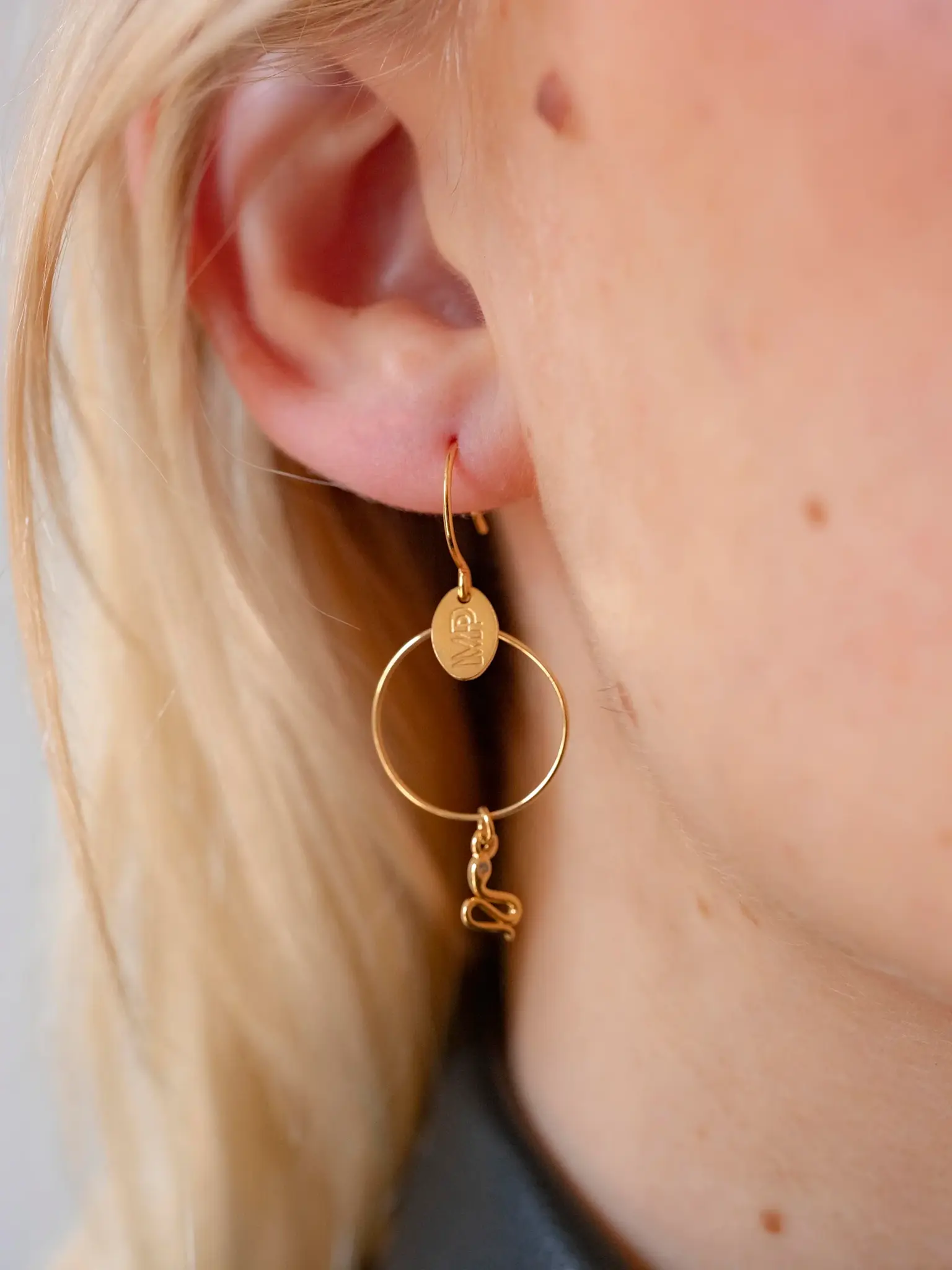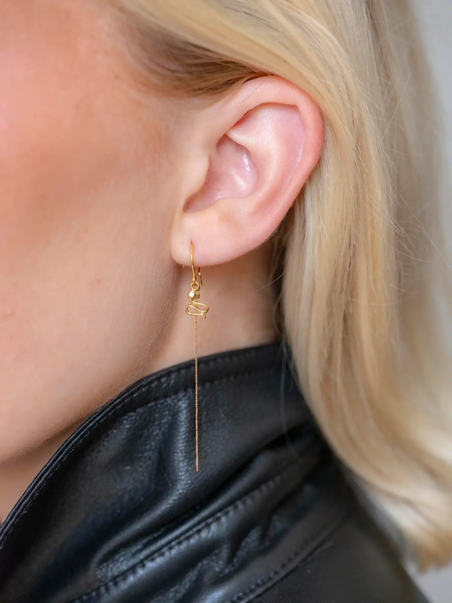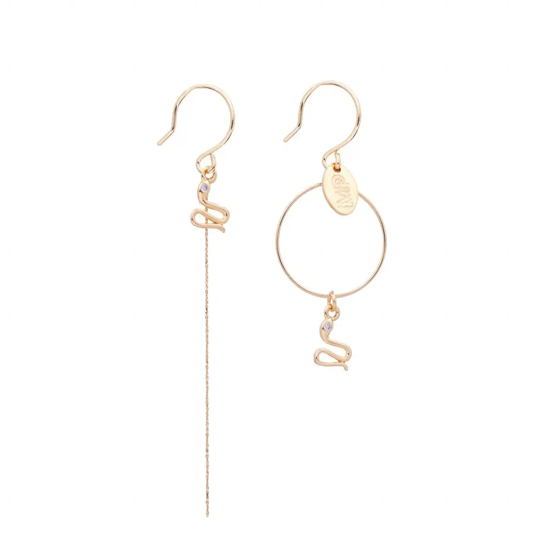 Dit paar asymmetrische oorringen in verguld staal heeft kleine slangen als accent. De oorhangers zijn 3,5 en 7 cm lang.