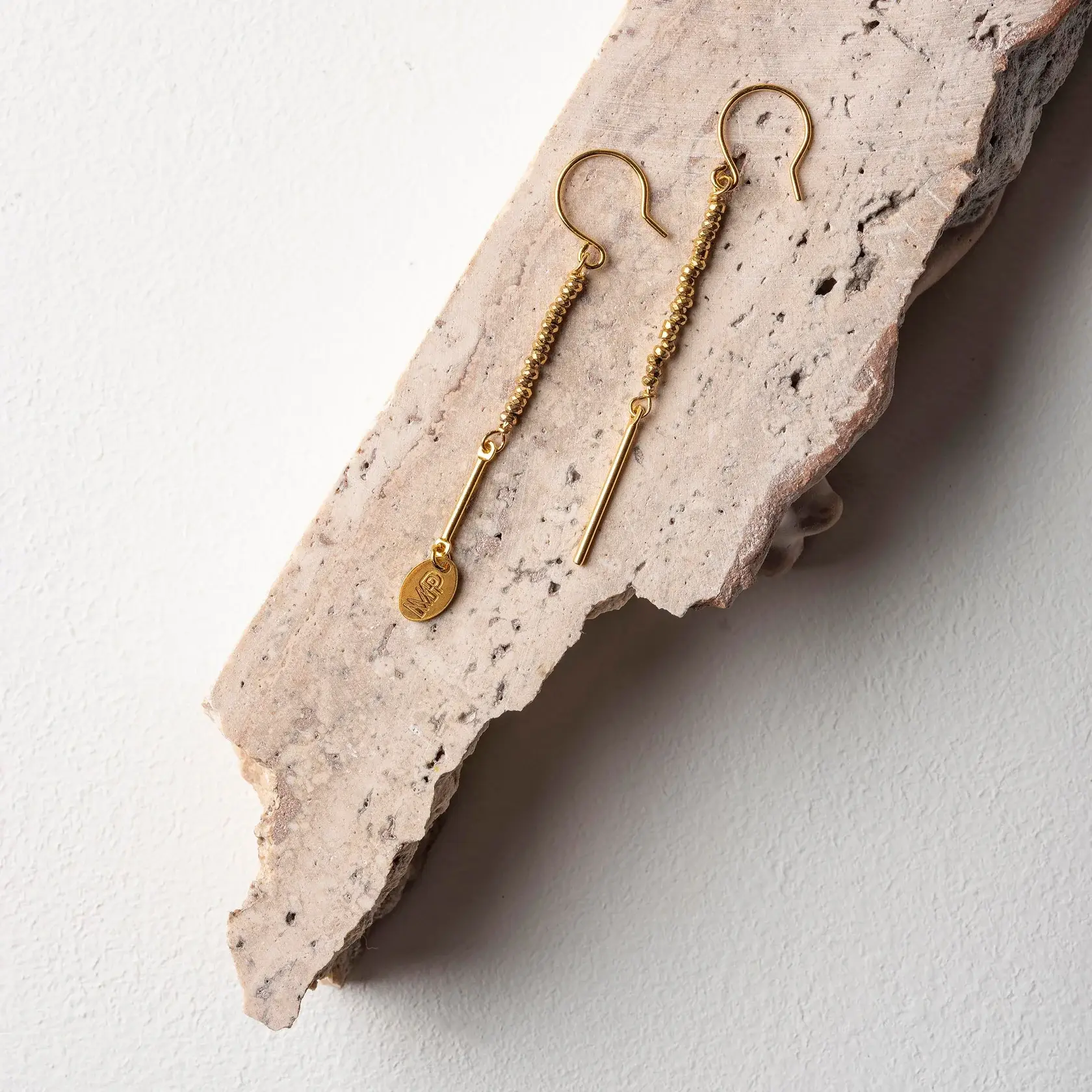 Dit paar asymmetrische oorringen in verguld staal heeft als accent kleine edelstenen hematiet. De oorhangers met halfedelstenen zijn 6 cm lang.