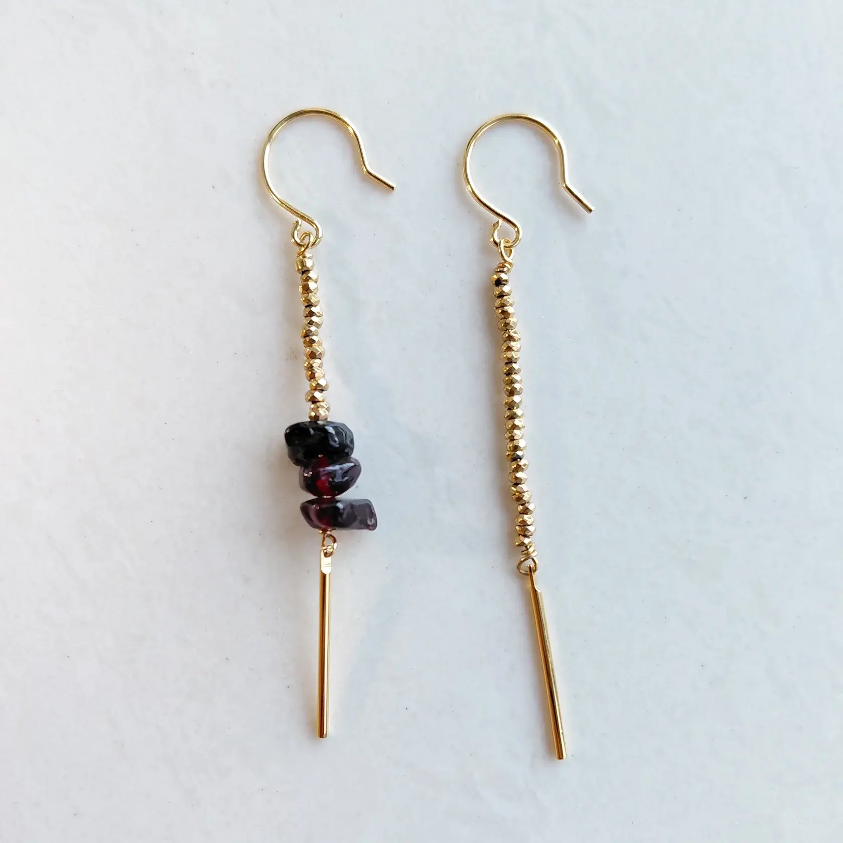 Dit paar asymmetrische oorringen in verguld staal heeft als accent kleine edelstenen hematiet en granaat. De oorhangers met bordeaux edelstenen zijn 6 cm lang.