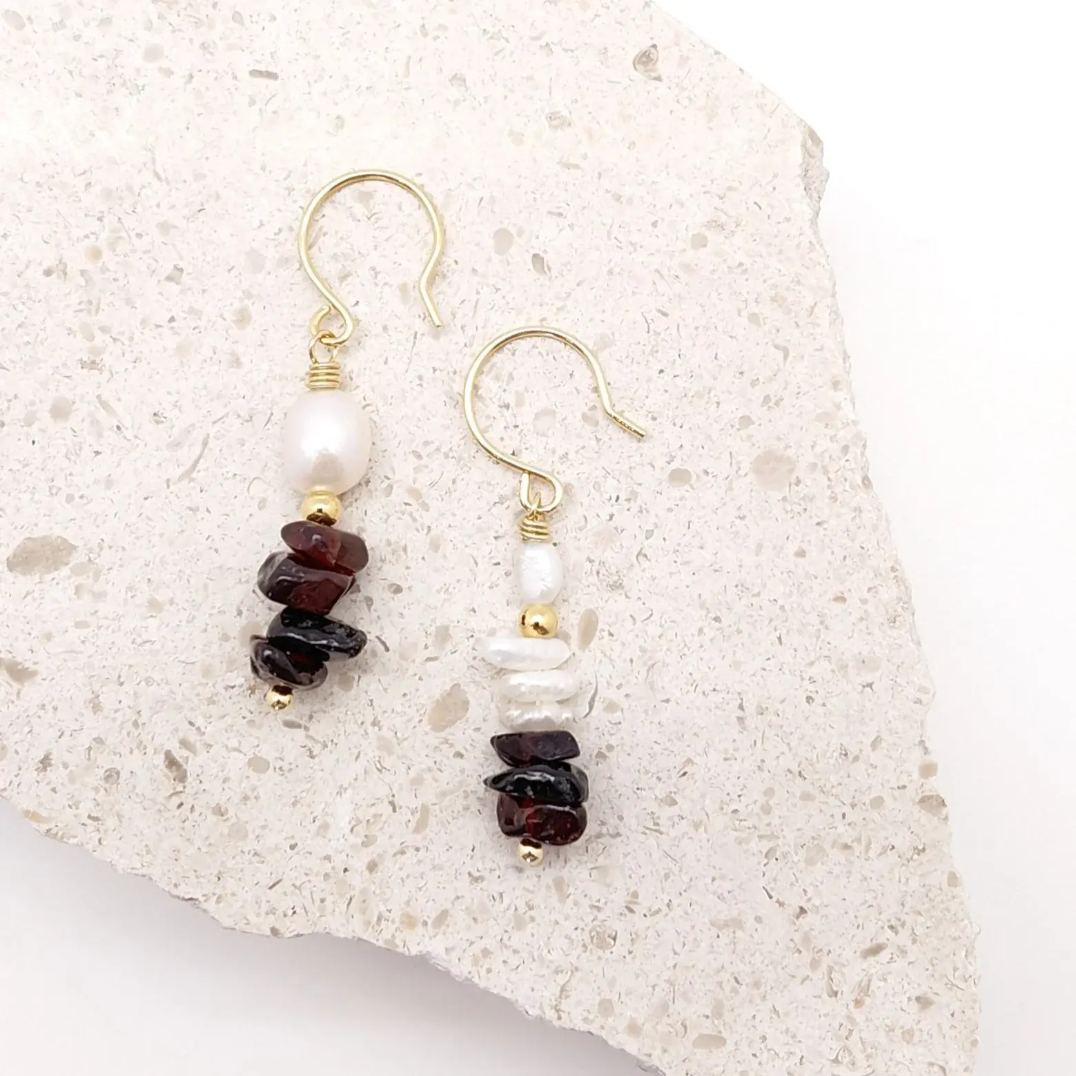 Dit paar asymmetrische oorringen in verguld staal heeft als accent granaat edelstenen en parels. De oorhangers met bordeaux stenen zijn 4 cm lang en verschillen subtiel van elkaar.
