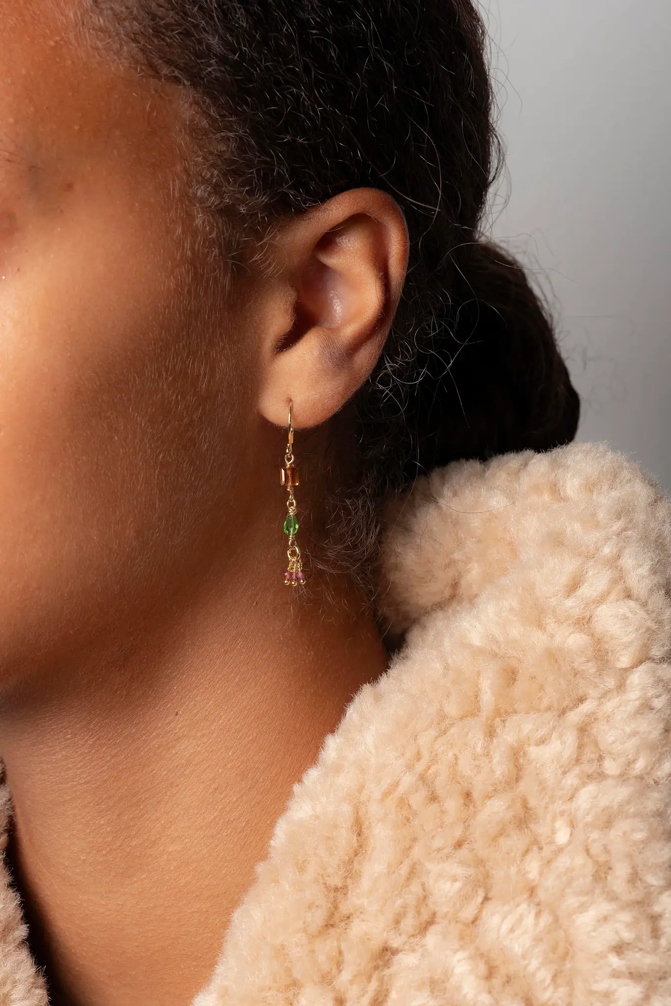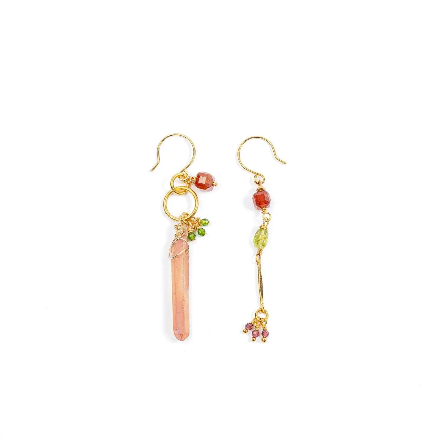 Dit paar asymmetrische oorringen in verguld staal heeft bergkristal en bordeaux granaat edelstenen als accent. De oorhangers zijn 6 en 5,5 cm lang.