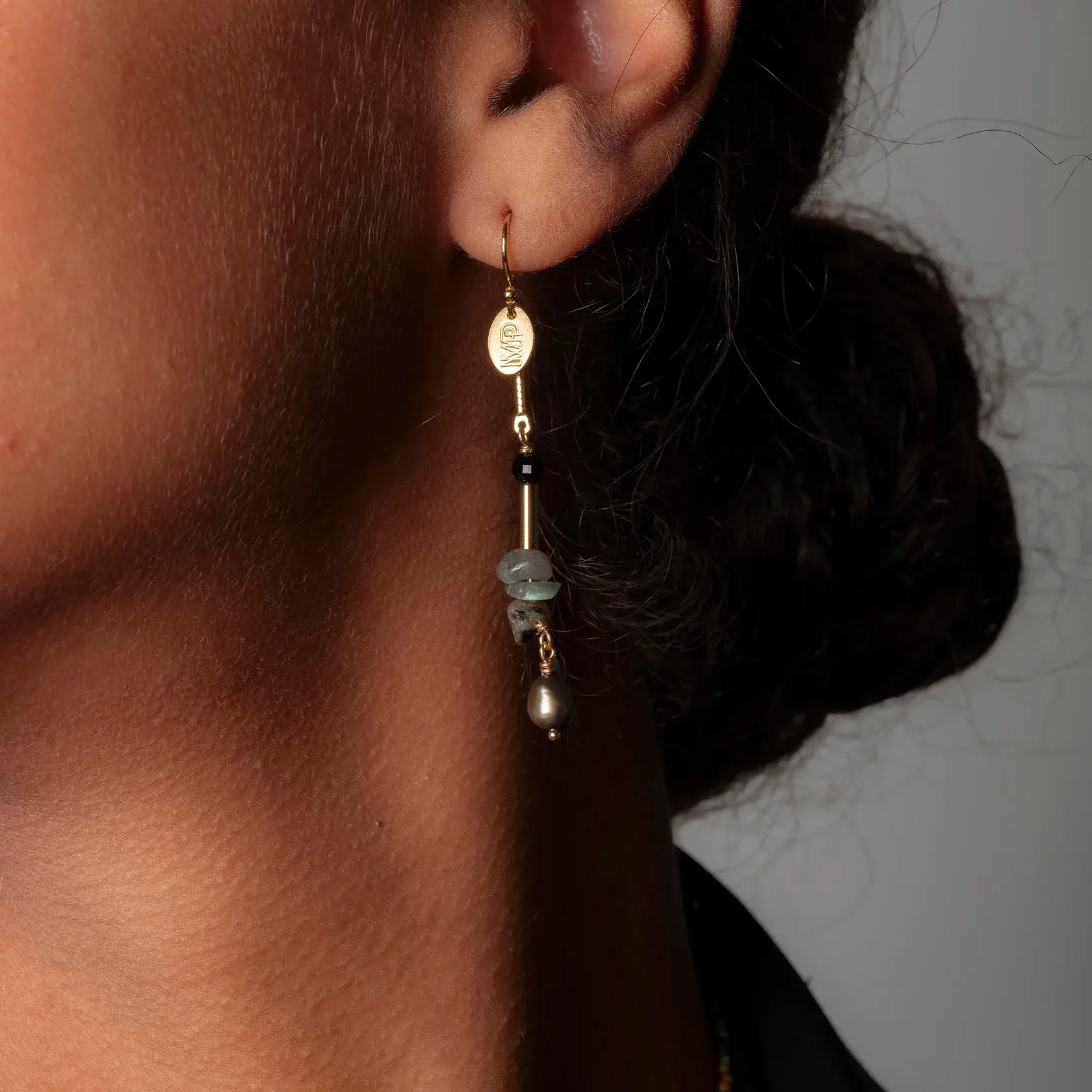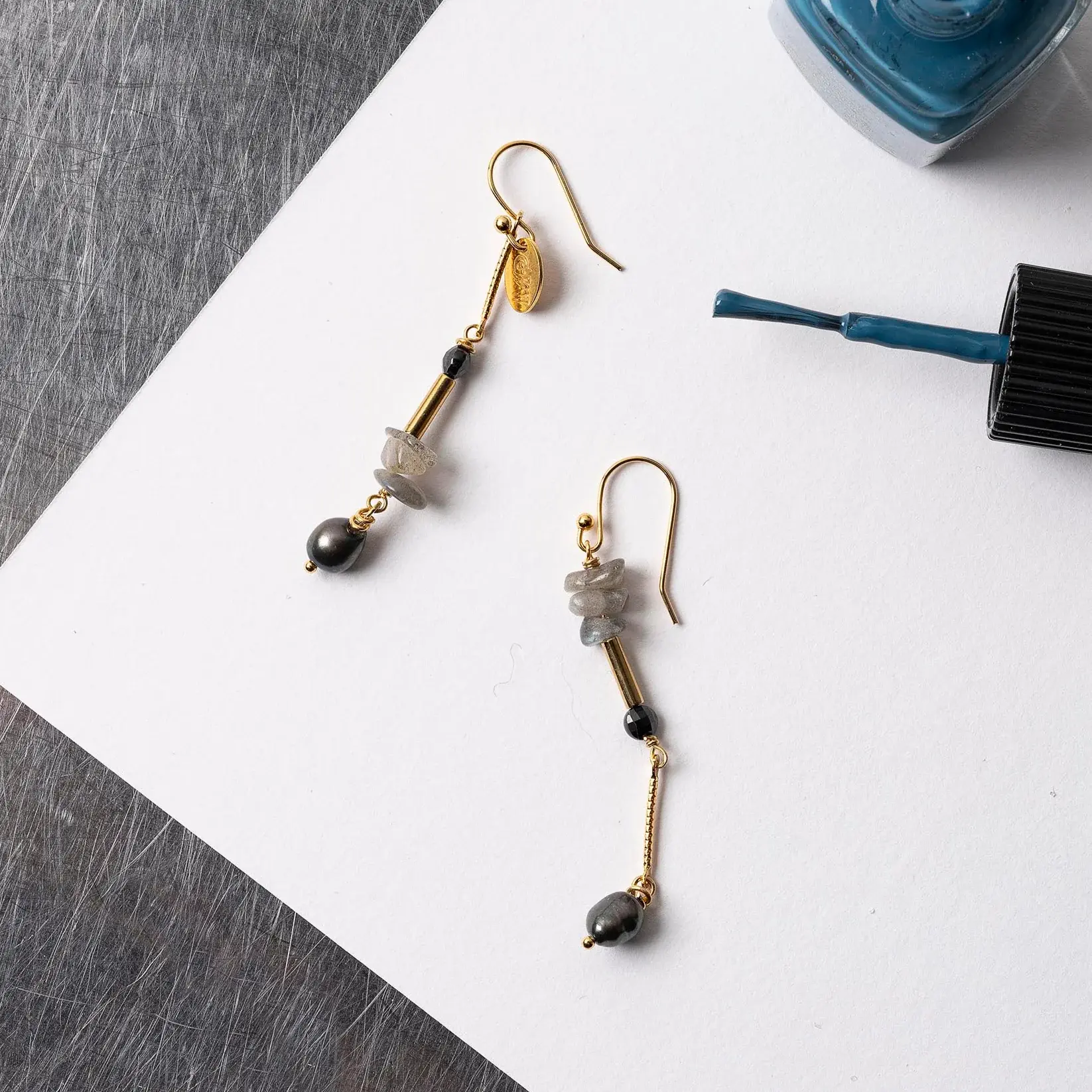 Dit paar asymmetrische oorringen in verguld staal heeft als accent de edelstenen onyx en labradoriet. De oorhangers in grijs en zwart zijn 6,5 cm lang.