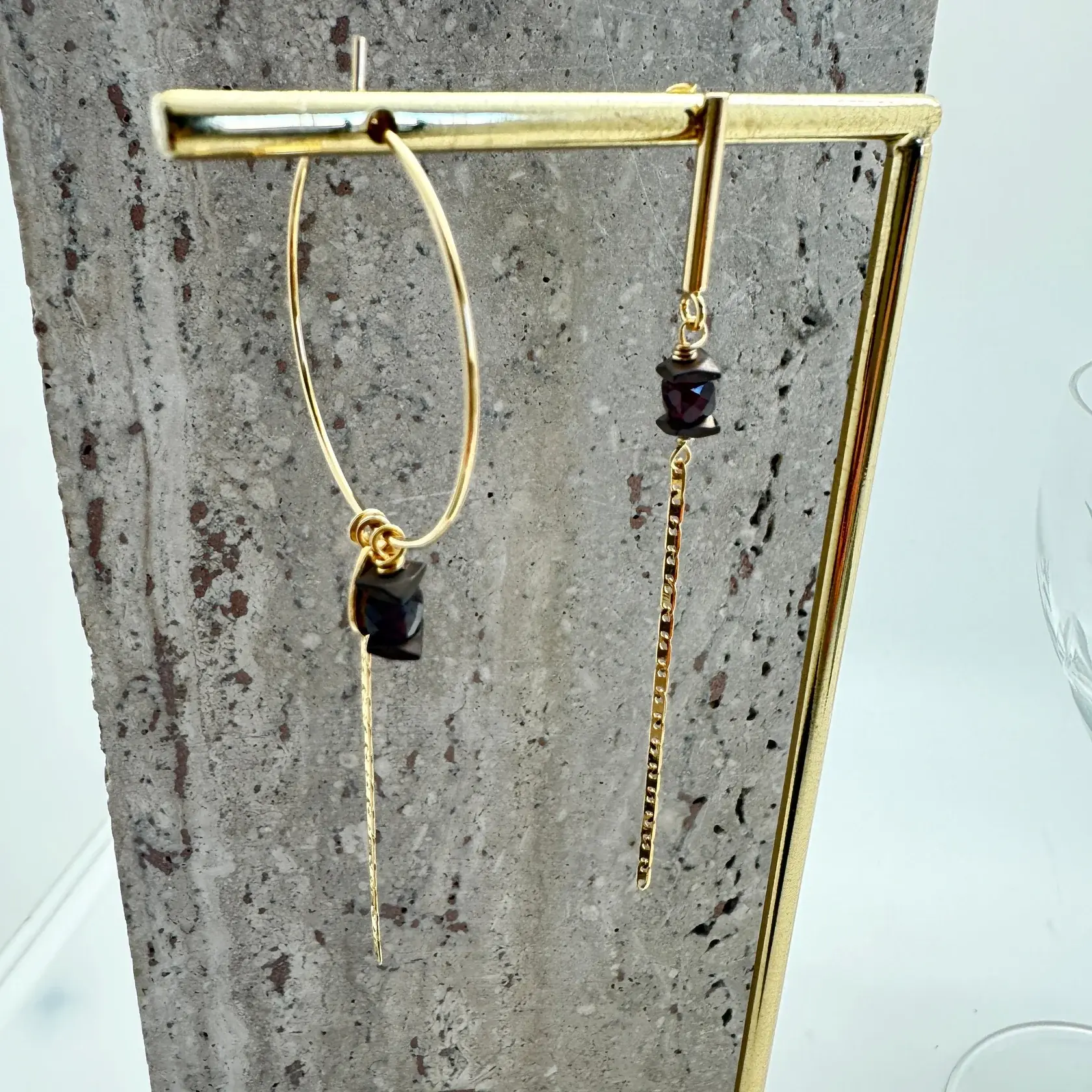 Dit paar asymmetrische oorringen in verguld staal heeft als accent een creool en bordeaux granaat met fijne schakelketting. De oorhangers met edelstenen zijn 9 cm lang. De cirkel heeft en diameter van 3 cm.