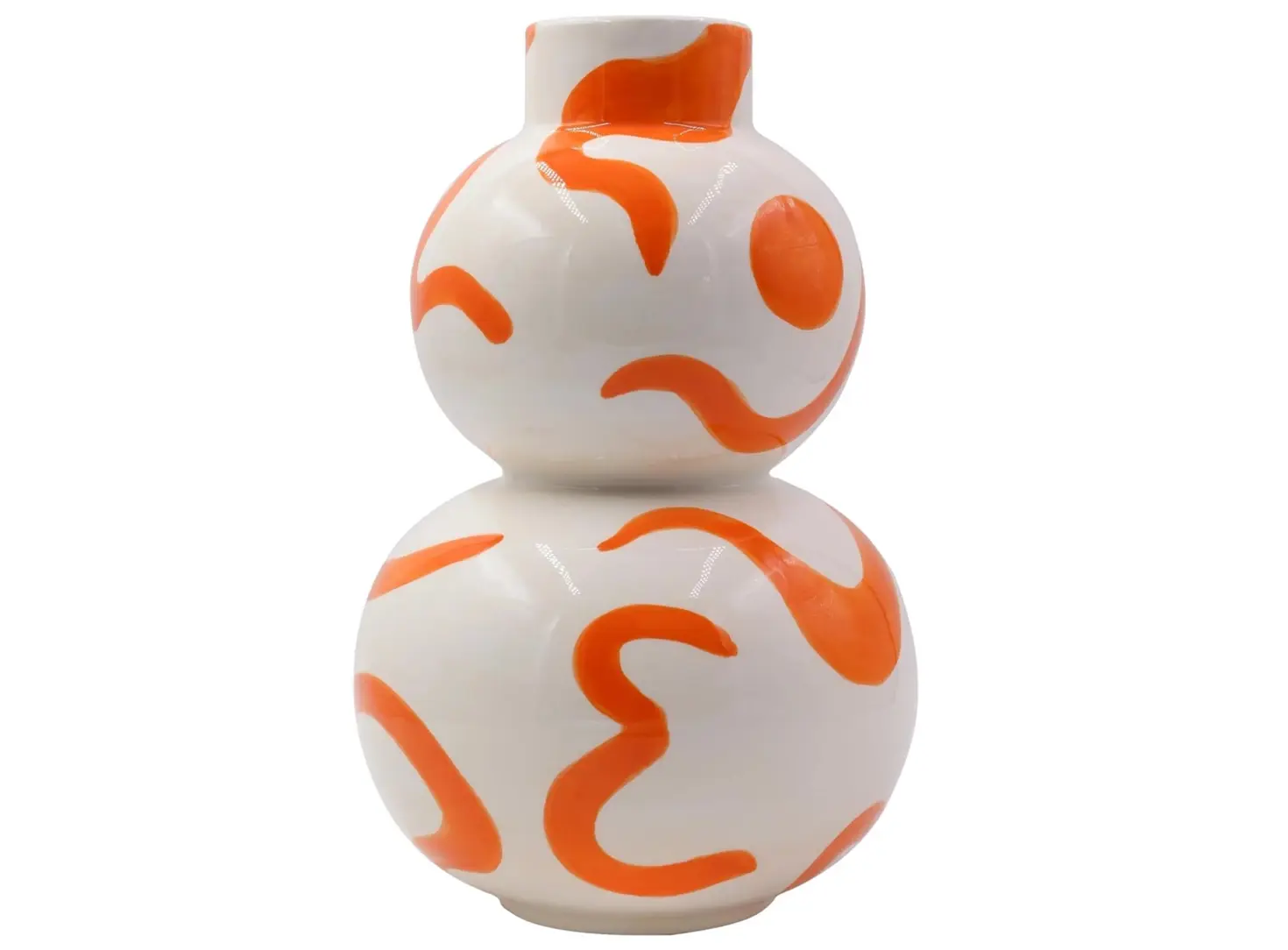 Zonnige witte vaas met handgeschilderd patroon in oranje. Breng de zon binnen met de vrolijke keramiek van Que Rico.
