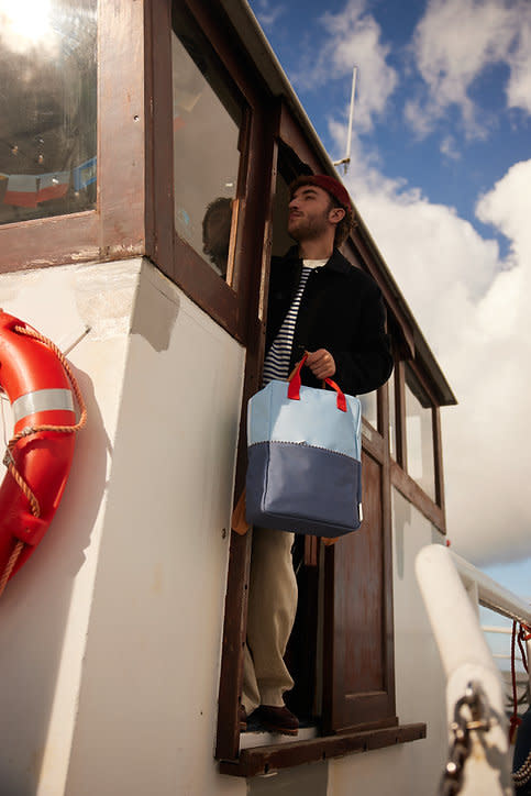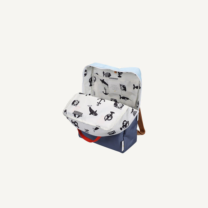 Deze hippe Sticky Lemon backpack in licht- en donkerblauw heeft vooraan een vak met twee drukknopen en binnenin een groot vak dat sluit met een rits. De twee handvatten zijn lichtblauw. De rugzak is waterdicht en heeft binnenin een elastische houder voor je drinkfles.