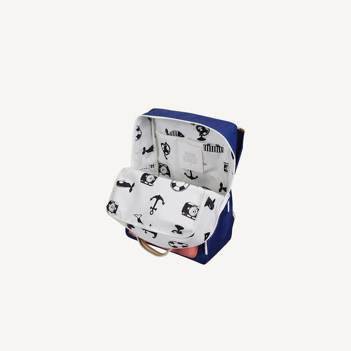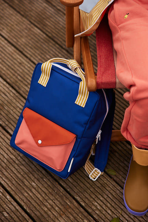 Deze hippe Sticky Lemon backpack in blauw heeft vooraan een roodroze enveloppevak met drukknoop en binnenin een groot vak dat sluit met een rits. De twee handvatten zijn groen gestreept. De rugzak is waterdicht en heeft binnenin een elastische houder voor je drinkfles.