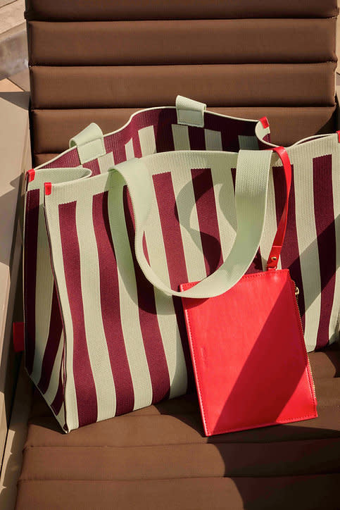Deze draagtas met streepjes is super praktisch voor je boodschappen of om andere spullen in mee te nemen. De streepjes in mist (munt) en fig (bordeaux) maken deze tas heel speciaal. Binnenin zit nog een afneembaar etui in rood. Hier kan je waardevolle spulletjes zoals je portefeuille, sleutels en / of smartphone in kwijt.