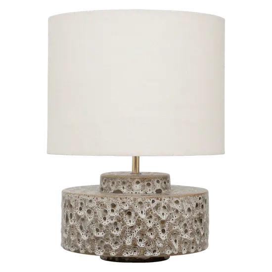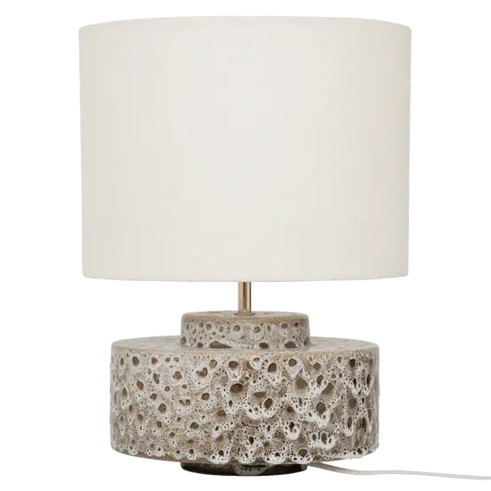 De voet van de lamp is gemaakt van aardewerk in bruin en off-white. De lampenkamp is gemaakt van off-white katoen. De lamp heeft een diameter van 30 cm en een hoogte van 40 cm. Geschikt voor lampen met een E27-fitting (niet meegeleverd).