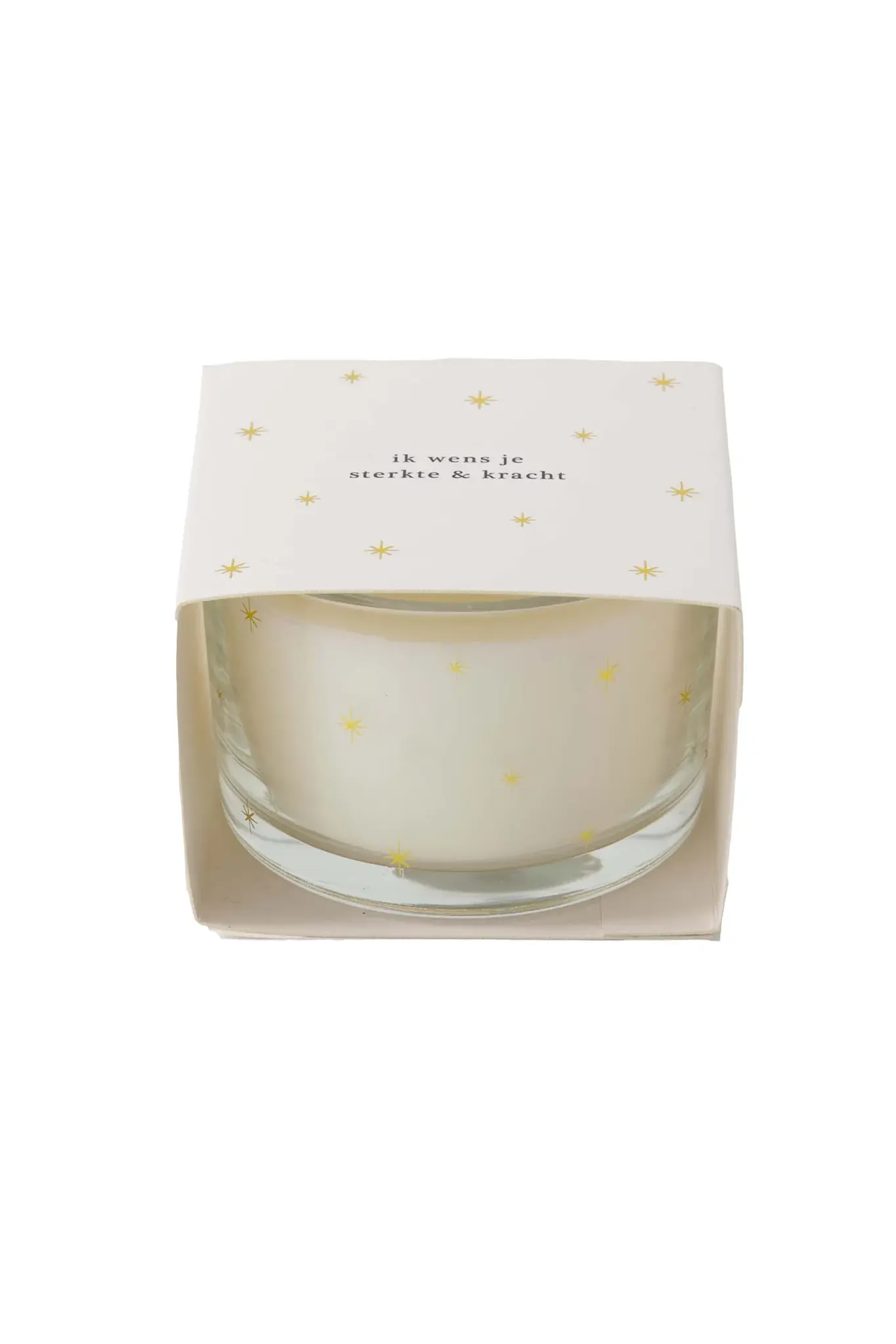 Deze geurkaars zit in een transparant glazen potje. Op het potje staan gouden sterren, en op de wikkel staat de tekst 'Ik wens je sterkte en kracht'. Wanneer je dit kaarsje aansteekt, verspreid je een heerlijke zachte maar subtiele geur in je huis.