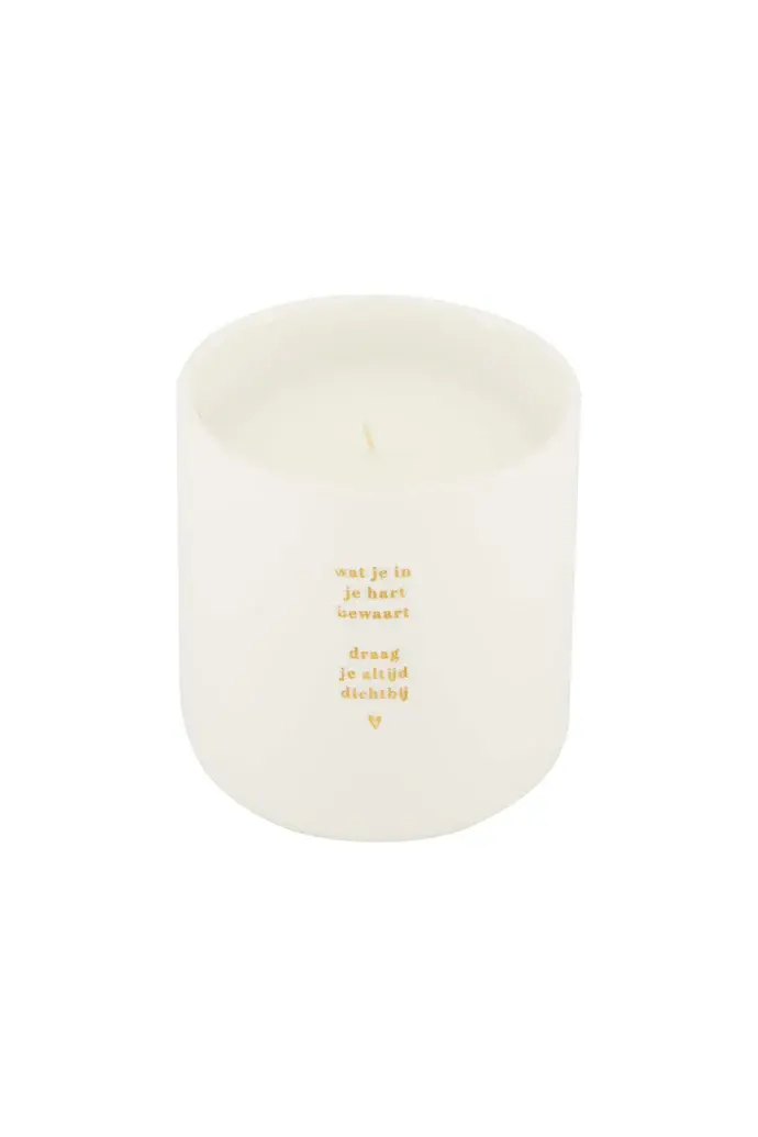 Deze geurkaars zit in een wit keramieken potje met gouden deksel. Op het potje staat de tekst 'Wat je in je hart bewaart draag je altijd bij jou'.