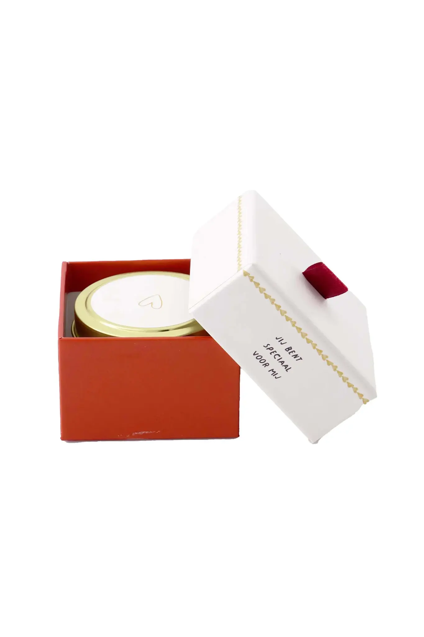 Deze mini geurkaars zit in een tinnen potje. Op het potje staat een tekening van een hartje. Bovendien zit ze in een schattig doosje met de tekst 'Jij bent speciaal voor mij'.