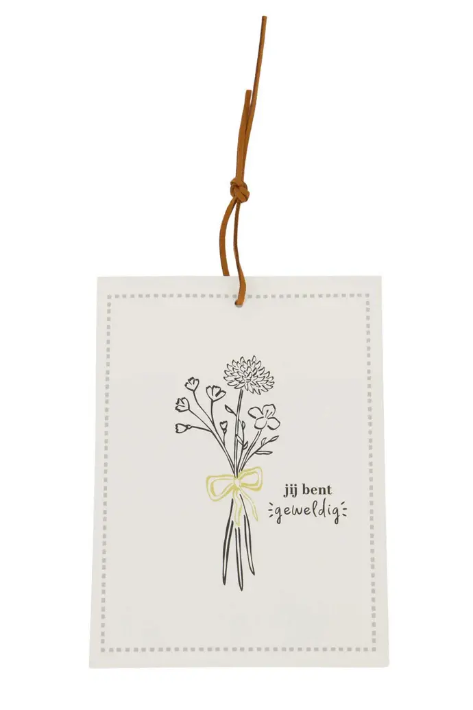 Op het papieren zakje staat een tekening van bloemetjes en de tekst 'Jij bent geweldig'. Een ideaal geschenkje.